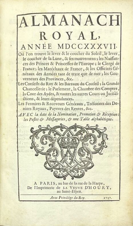 Mis en ordre et publié par DEBURE, gendre de feu D' HOURY, 1789 0 un volume in-8° (125 x 200mm), [1] ff. (titre) (32) puis 33-714 pp. Reliure époque en veau fauve porphyre, dos à nerfs orné de pièces de titre et d'année, caissons à fleur de lys dorés, triple filet et fleur de lys d'angle doré.e.s sur les plats, roulette sur les coupes, tranches dorées, gardes marbrées. (volume frotté, manque aux coiffes et aux coupes, coins émoussés, présence de quelques pâles rousseurs). Le dernier Almanach Royal avant la Révolution Française. Vignette de titre gravée. RARE