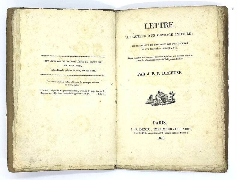Très rare ouvrage constituant pour Caillet la « réfutation savante de cette brochure diabolique de l’ex-abbé Wendel-Wurtz ». Joseph-Philippe-François Deleuze (1753-1835) était bibliothécaire au Museum national d'histoire naturelle à Paris et naturaliste adepte du magnétisme. Caillet, I, 422.