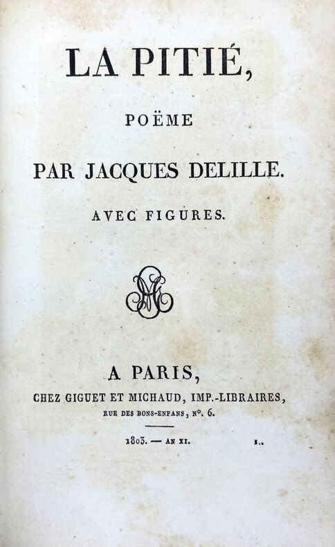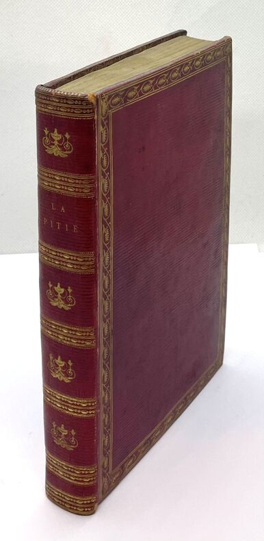 1803, Giguet et Michaud, in-8 plein cuir de 206 pages, titrage et ornements dorés sur dos, La pitié, poème en quatre chants avec quatre figures | Etat : Bon état, couverture défraîchie et usée, nombreuses rousseurs, dos usé (Ref.: J10845)