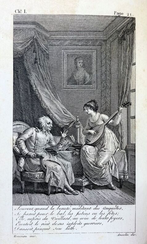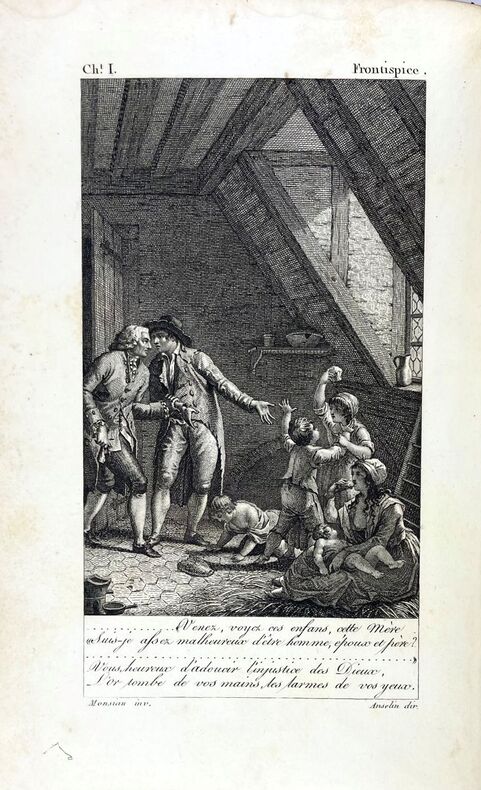 Édition originale ornée de 2 figures de Monsiau, dont une en frontispice. Leur nombre varie selon les exemplaires (entre une et cinq). Ces chants peignent « la pitié dans les temps de spoliation et d'émigration. » Jacques Delille (1738-1813) entra à l'Académie française en 1772 et devint le favori de la mode et le poète des salons. « La Révolution vînt le blesser dans ses affections et dans ses intérêts. Il choisit de s'exiler en Suisse et en Allemagne, où il composa son poème de la Pitié, avant de séjourner deux ans en Angleterre » (cf. Larousse du XIXe siècle). Bel exemplaire agréablement relié à l'époque. Petites auréoles au second plat et sur quelques feuillets. Monglond, VI, 296.