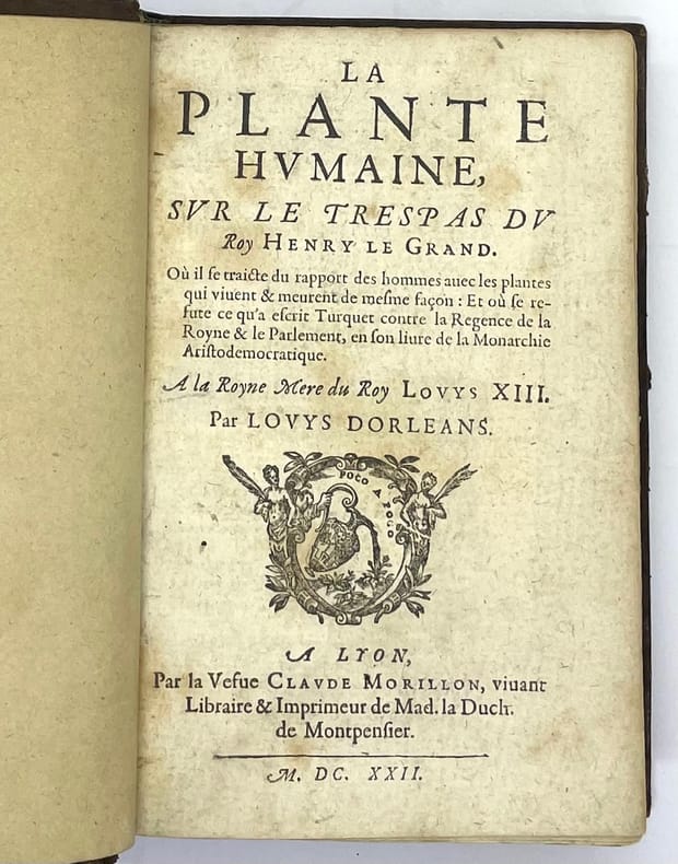 Deuxième édition, aussi peu commune que la première, parue en 1612. L'ouvrage est dédié à plusieurs reprises à la reine Marie de Médicis. L'auteur avait, au temps des guerres de religion, pris le parti de la Ligue. Il passa les années suivant l'avènement d'Henri IV à tenter de compenser ses erreurs de jeunesse. Ce traité réunit de nombreuses anecdotes curieuses, parfois sensées, parfois fantaisistes, sur le « biomimétisme » et compare à de multiples reprises l'histoire des hommes et le génie végétal.- Pâles rousseurs. Graesse, I, 428.