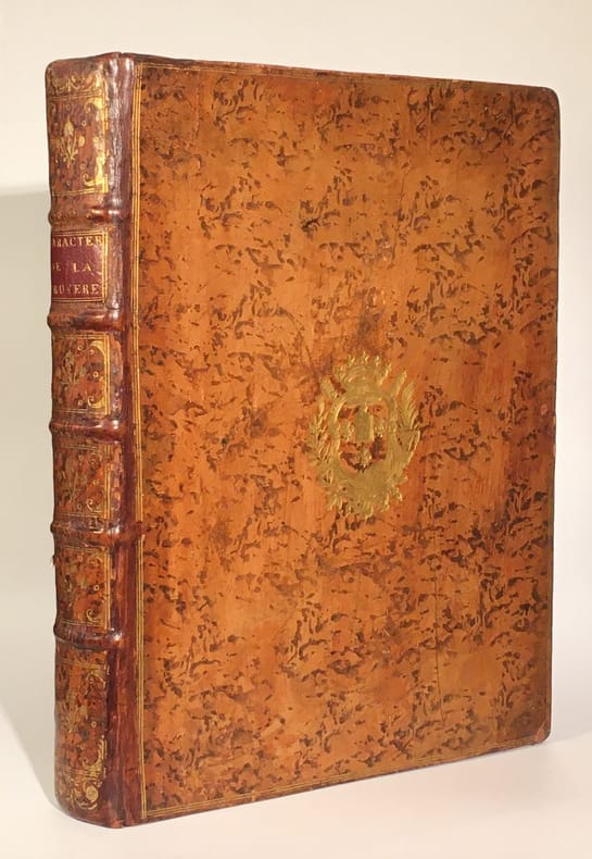 Paris Hochereau et Panckoucke 1765 -in-4- plein-veau 1 volume, reliure plein veau havane moucheté grand in-quarto (binding full calfskin in-4)(29 x 22,2 cm), RELIURE D'ÉPOQUE, dos à nerfs (spine with raised bands), décoré "or"et à froid (gilt and blind stamping decoration), titre frappé "or", pièce de titre sur fond bordeaux avec un double filet "or" en encadrement, entre-nerfs à fleuron au fer ajouré (floweret) "or" dans un encadrement de deux filets "or" avec rinceaux "or" aux angles, filet à froid de part et d'autre des nerfs, roulette "or" et double filet "or" en tête et en pied, plats décorés "or" d'un triple filet "or" en encadrement, plats légèrements tachés et présence d'une épidermure légère, coiffe de tête manquante (à restaurer), double filets "or" sur les coupes avec léger manque de dorure, toutes tranches lisses peignées bleues et rose, pages de garde peignées à motif "caillouté" (painting flyleaf), Edition ornée d'un Portrait de La Bruyère en frontispice gravé sur cuivre en noir par Louis-Jacques CATHELIN d'aprés le Peintre GÉRARD DE SAINT-JEAN + vignette de titre, 3 en-têtes et un cul-de-lampe par Hubert-François GRAVELOT gravés sur cuivre en noir par Duclos et Lebas, VIII + 484 pages, 1765 à Paris chez Hochereau et Panckoucke Editeurs,