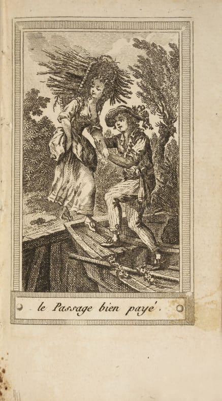 Frontispice et 12 ravissantes figures. Les poésies et chansons son entièrement gravées. On n'a pas relié de calendrier avec l'almanach, mais un cahier de papier blanc pour les notes. Titre non répertorié par Grand-Carteret.