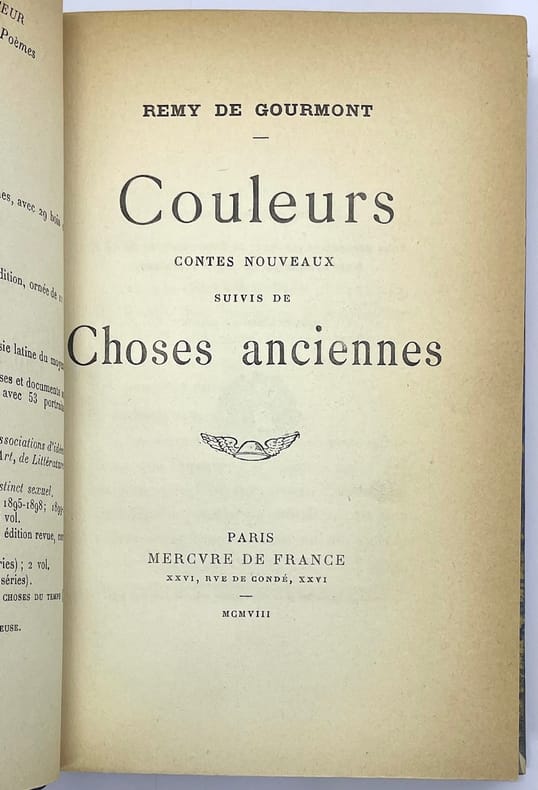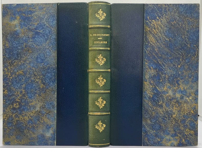 Paris, Mercure de France, 1908 ; in-12 de 244 pp., [1] f., 1 f. bl., reliure postérieure demi-chagrin bleu, dos à nerfs orné, tête dorée, premier plat de la couverture illustrée en couleurs.