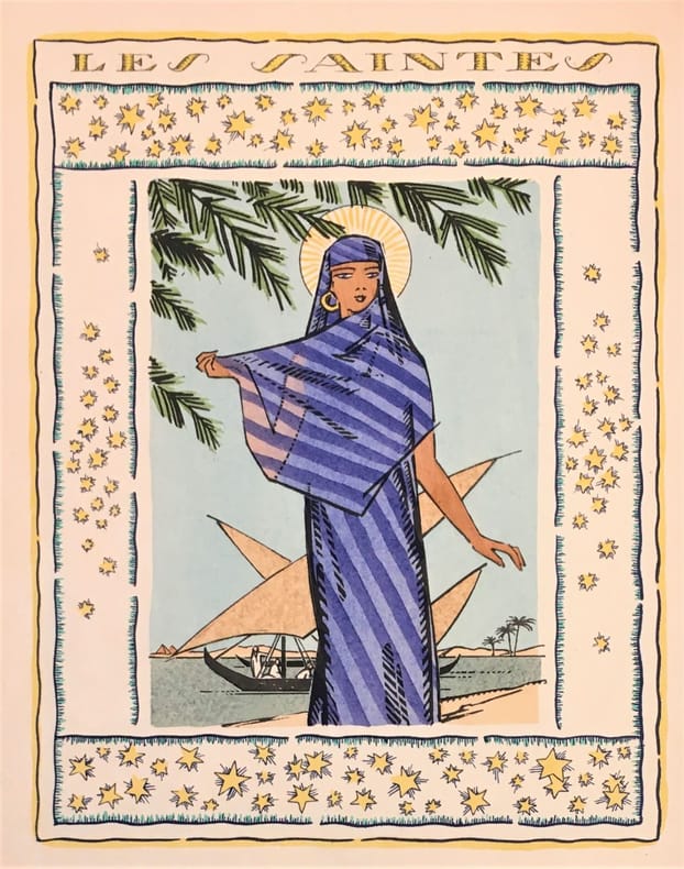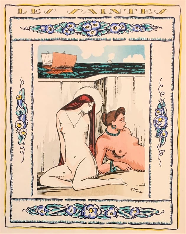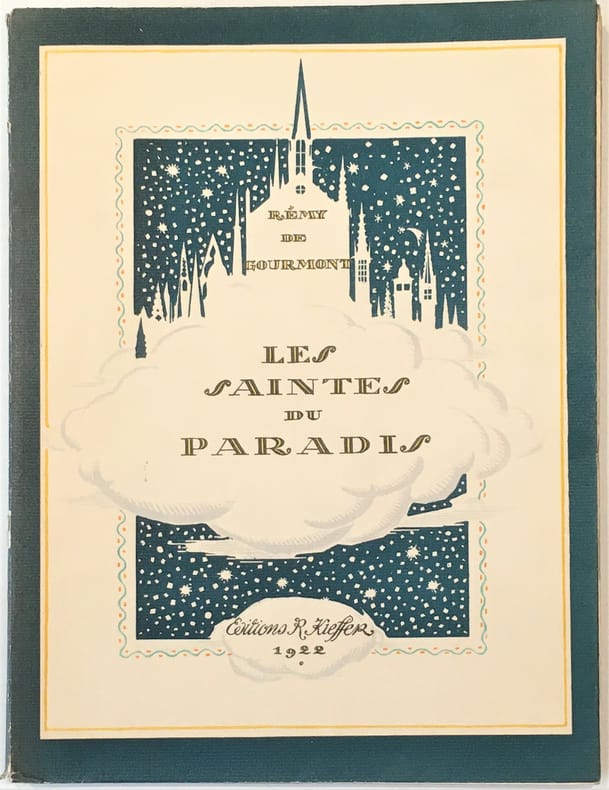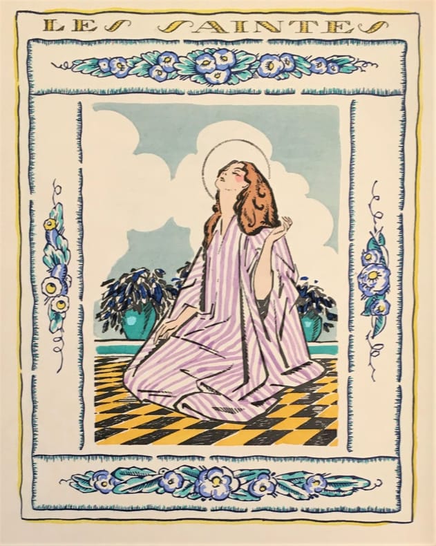 petit in-4, n.p. [40] ff., entièrement illustré en couleurs (bordures, vignettes et planches: portraits de 20 saintes), Couverture illustrée couleurs. :: Tirage à 550 exemplaires. Un des 500 numérotés sur vélin de cuve. La mise en couleurs par Charpentier. Textes calligraphiés. :: A noter l'hommage à sainte Natalie (Clifford Barney), l'Amazone rencontrée en 1910, chère à l'auteur.:: Jolie reliure ornée à la plaque (timbre de Kieffer), plein maroquin havane, motif floral de guirlandes entrelacées à froid sur les plats. Timbre de la librairie Déom, ex-libris humide de l'écologiste Pierre Dansereau. Bel état.