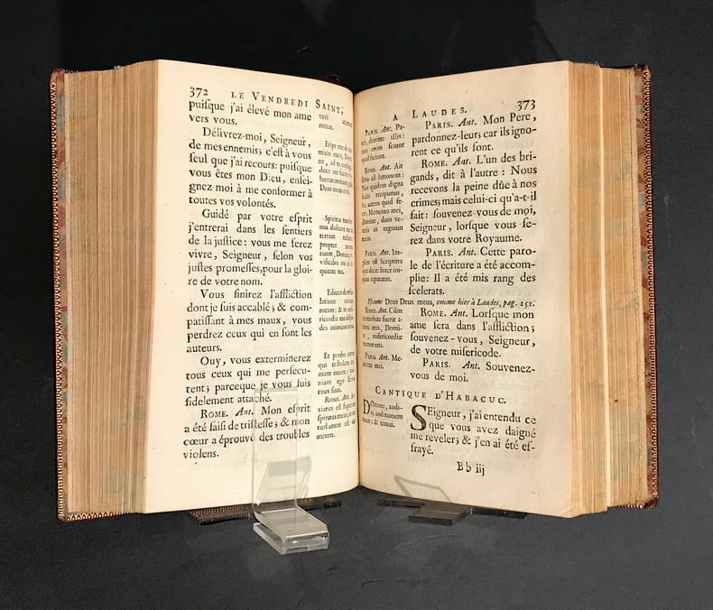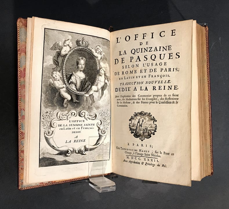 1732 Paris, Hansy, 1732. In-8, 3 feuillets non chiffrés (titre-frontispice, page de titre et épitre) 724 pages plus approbation et privilège, texte sur deux colonnes. Reliure époque plein maroquin rouge, dos à nerfs orné de caissons et fleurons dorés, encadrement d'une large frise et de filets dorés sur les plats, tranches dorées. Frontispice représentant la reine et 2 figures hors-texte non signées.