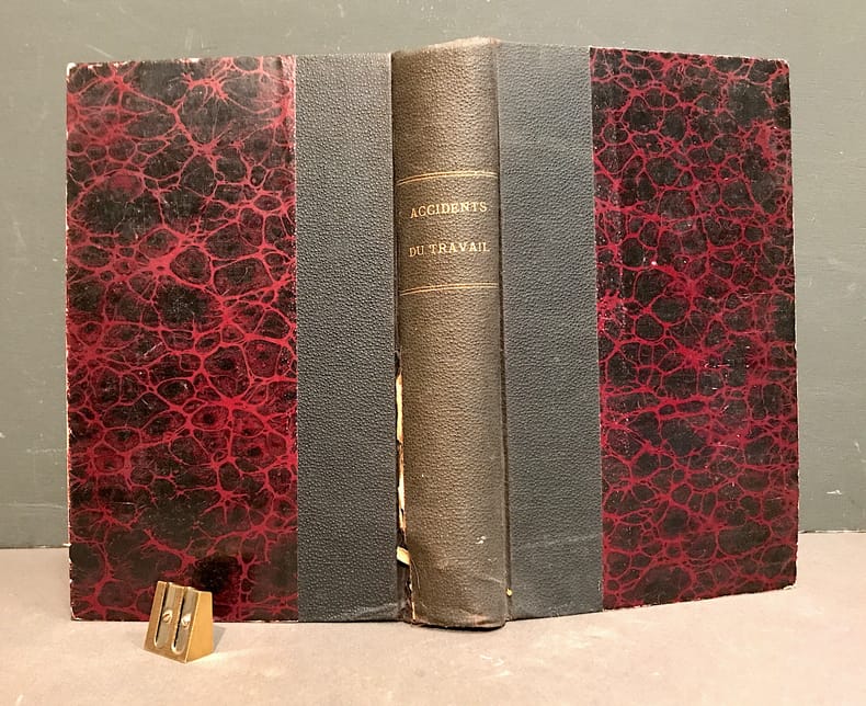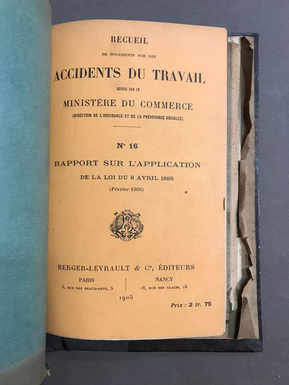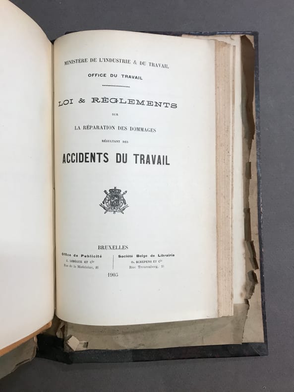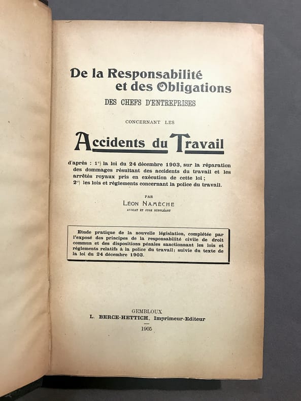 Namèche (Léon). De la Responsabilité et des Obligations des chefs d'entreprises concernant les Accidents du Travail. Gembloux, Berce-Hettich, 1905 ; 163 pages. Recueil de documents sur les accidents du travail réunis par le ministère du commerce... N°16. Rapport sur l'application de la loi du 9 avril 1898 (Février 1905). Berger-Levrault, 1905 ; 236 pages. Loi et Règlement sur la réparation des dommages résultant des accidents du travail. Bruxelles, Office de Publicité, s.d. ; 112pp.-1f. Loi & Règlements sur la réparation des dommages résultant des accidents du travail. Bruxelles, Office de Publicité, 1905 ; 135pp.-1f. - Cachets du "Petit Journal du Brasseur". Une charnière fendue.