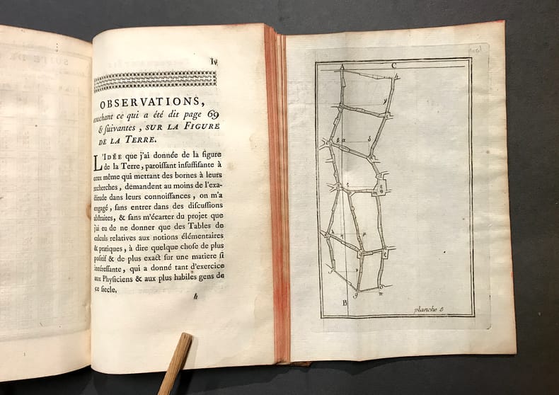 Édition originale. Un charmant bandeau gravé en taille-douce par Cochin d'après Le Clerc montre des astronomes en observation. Les planches gravées au trait montrent des figures géométriques. La théorie occupe les 132 pages, suivent les tables, puis des "Observations, touchant ce qui a été dit page 69 & suivantes, sur la Figure de la Terre". Le géographe et graveur Jean de Lagrive (Sedan 1689 - 1757) édita un plan de Paris en 1728, puis il collabora avec Cassini à la détermination du méridien de Paris. (Quérard IV, p. 433). - Intérieur frais, menues éraflures sur le plat, marges de la première garde brunies, le feuillet XCI (errata) placé par erreur après le titre.