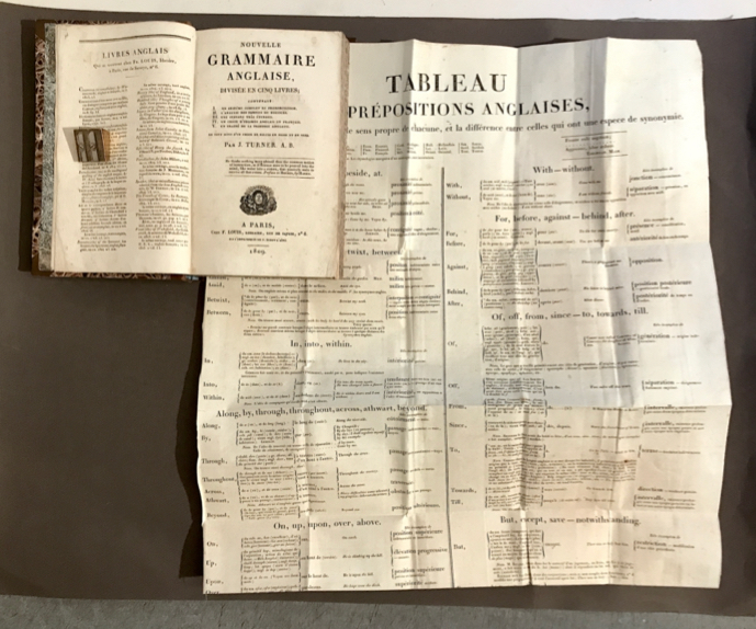 Système complet de prononciation ; Analyse des parties du discours ; syntaxe ; choix d'idiomes anglais et français ; Traité de prosodie anglaise ; choix de pièces en prose et en vers. Grand "Tableau des prépositions anglaises, où l'on indique, par l'étymologie, le sens propre de chacune, et la différence entre celles qui ont une espèce de synonymie". - Exemplaire frais.