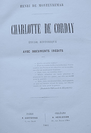 1938 Argentan, Editions du Pays d'Argentan, 1938, 1 volume broché, 225 x 140 mm., 220 pp., 15 planches hors texte, portraits de Charlotte Corday et châteaux et demeures où vécurent Charlotte et sa famille, un plan dépliant du Pays d'Argentan, in fine, reproduction de la dernière lettre de Charlotte à son père, plan du Ronceray. petit manque angulaire, au second plat et en tête du dos, tampon bibliothèque Evêché, aux premières pages, du reste, bonne condition