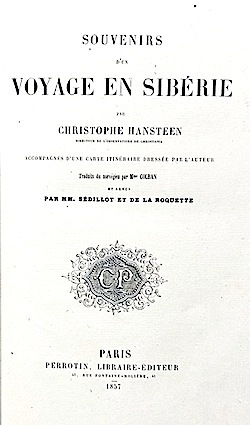 Première édition française. Voyage à but scientifique qui fut mené de 1827 à 1830 pour affiner les connaissances sur le magnétisme terrestre. Le mathématicien Christoph Hansteen, qui finit directeur de l'Observatoire de Christinia (actuel Oslo), s'intéressa en effet à ces questions dès 1807. Relation donnant des renseignements exacts sur la Sibérie ainsi que sur les caractères, les moeurs et les coutumes de ses habitants. Ouvrage accompagné d'une carte repliée (itinéraire dressée par l'auteur). Bel exemplaire sur papier de Hollande.