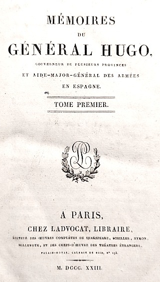 Édition originale. Les célèbres mémoires du père du poète intéressent au premier chef l'Italie napoléonienne et la guerre d'Espagne. Le premier volume relate la guerre de Vendée, la campagne de l'an VIII puis l'Italie, Fradiavolo ; il se termine par des considérations sur l'art et la médecine militaires. Le second volume contient le "Précis historique des événemens qui ont conduit Joseph Napoléon sur le trône d'Espagne..." (102 pages) avant de poursuivre par la guerre d'Espagne ; le troisième volume contient la relation du siège de Thionville qui avait paru à part précédemment. (Tulard, 712 - Vicaire IV, col. 225 - Quérard IV, p. 157). - Exemplaire tel que paru, frais, mais auquel il n'a pas été joint les Mémoires du général Aubertin, 175 pages devant se trouver au début du premier volume, qui débute pour cela directement par le titre courant "Mémoires du général Hugo," (sic).
