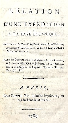 Première édition française publiée l’année de l’originale anglaise. Texte fondateur pour l’histoire de la colonisation de l’Australie, traduite par Charles Pougens (1755-1833).Officier de la marine britannique, Watkin Tench (1758-1833) parti d’Angleterre en mai 1787 arrive en Australie à bord de la Charlotte, accompagnant un convoi de 730 condamnés envoyé à Port-Jackson pour y fonder une colonie sous l’autorité d’Arthur Phillip. Son voyage passa par le Brésil et le cap de Bonne-Espérance ; il rencontra les navires de La Pérouse qui quittaient la Baie Botanique en mars 1788, quelques semaines avant leur disparition près des îles de Vanikoro. L'inauguration et l’organisation de la colonie formée à Sydney-Cove (ainsi baptisée en l’honneur du vicomte de Sydney, alors ministre de l'Intérieur britannique), les rencontres avec les Aborigènes et les conseils aux futurs colons furent relatés dans cette Relation d'une expédition à la baye botanique publiée la même année que le Voyage à la Baie Botanique, deux ouvrages que Tench consacra à ses voyages en Nouvelle-Galles du Sud, publiés la même année et rapidement considérés parmi les meilleurs des récits contemporains.Très bon exemplaire. Nombreuses erreurs de pagination dans le cahier A sans manque, petits accidents sur le second plat.Conlon, 89.11053 ; Boucher de la Richarderie, VI, 419 ; Chadenat, 4408 ; Ferguson, 54.
