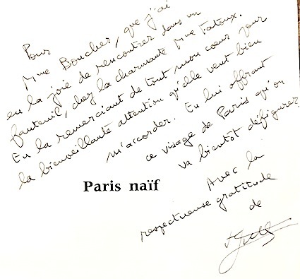 Magnifique exemplaire parfaitement relié, en état superbe, enrichi d'un envoi de l'auteur. "Et Paris naïf, qu'est-ce que c'est ? Le Paris tel qu'il était, ou à peu près, au jour de sa naissance [ ... ] Ce sont les lambeaux de ce Paris que je veux saluer avec qu'ils ne soient mangés par les excavatrices et remplacés par ces menhirs d'habitation qui insultent le ciel". Paul Guth (1910-1997) reprend ici l'adjectif "naïf" qu'il utilisa avec un si grand succès dans de nombreux écrits (Mémoires d'un naïf, Le Naïf aux quarante enfants, etc...)