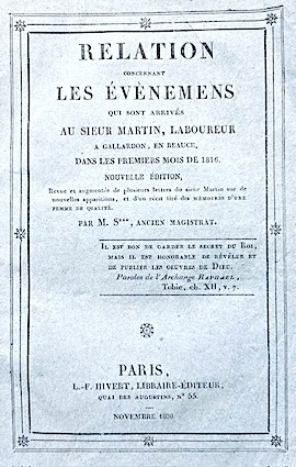 Nouvelle édition revue et augmentée de plusieurs lettres du sieur Martin écrites en 1821, sur de nouvelles apparitions, et d'un récit tiré des Mémoires d'une Femme de qualité (Quérard, IX p.152). Très bon exemplaire.