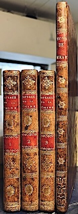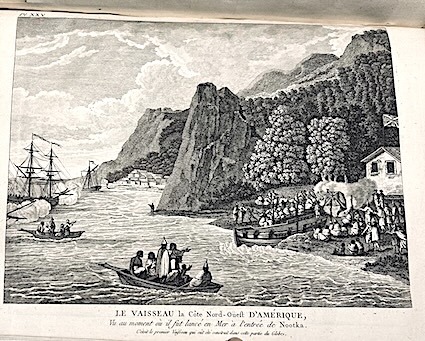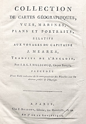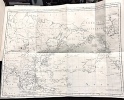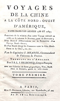 Première édition de la traduction française (l'originale, parue à Londres en 1790, comporte le même nombre de planches). Meares fut l'un des fondateurs de la North-West-America Company chargé d'établir des relations commerciales avec les indigènes de l'Amérique russe, des îles de la mer de Béring et de l'archipel Aléoutien. Le commerce des fourrures était le principal objet de cette compagnie (Sabin 47262 - Cordier B. S. 2104 - Leclerc 953). "Relations de voyage de Meares sont riches et bien écrites, dans un style clair et descriptif, passionnantes à plus d'un titre, notamment sur les Indiens, les Russes ou les habitants des îles. L'expédition de Meares avait le double objectif de découvrir un passage au nord-ouest et de donner plus d'étendue au commerce. Dans le second voyage exécuté en 1786 sur le vaisseau le Nootka, parti du Bengale, Meares aborde aux îles Sandwich et aux Philippines. Il donne d'amples détails sur les habitants du détroit de Nootka, notamment sur le commerce des fourrures et de la pêche à la baleine". Exemplaire complet de l'atlas comprenant 28 planches dont un portrait du capitaine John Meares et 3 cartes repliées, de la mer pacifique du nord, de la partie intérieure de l'Amérique septentrionale, ainsi que de la côte nord-ouest d'Amérique et de la côte nord-est d'Asie, reconnues en 1778 et 1779 par la capitaine Cook. Les autres représentent des vues, des plans, ainsi que des portraits. Bel exemplaire dans une reliure très décorative, malgré quelques frottements.