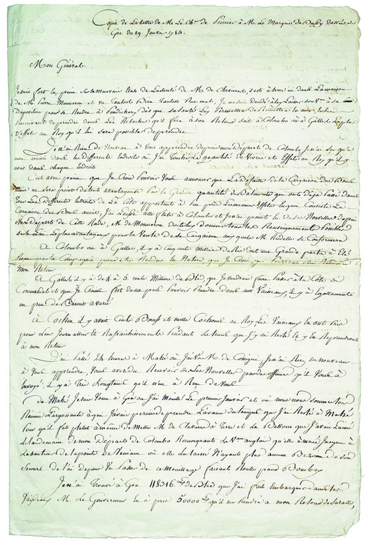 Goa, 19 janvier 1784. 3 pp. in-folio (43 x 27,4 cm) sur une feuille double, pliée.