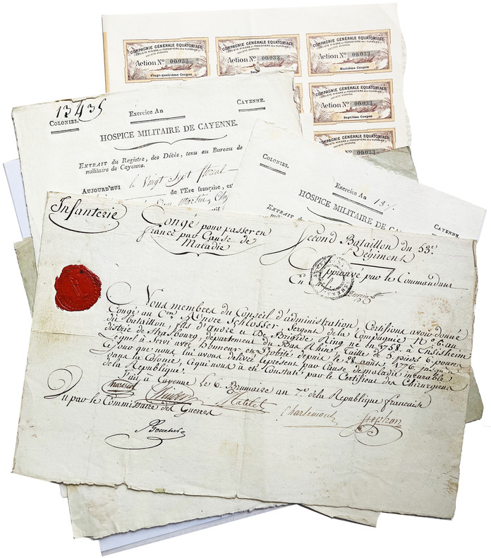 Intéressante réunion de lettres et pièces signées sur la Guyane. Cet ensemble comprend: - Congé pour passer en France pour cause de maladie. Pièce manuscrite signée. Cayenne, 6 brumaire an 7 [27 octobre 1798]. In-8 oblong (20,8 x 33,1 cm) de 1 p. ; sceau de cire rouge et cachet à l’encre noire. Le retour d’un militaire malade du 2e Bataillon du 53e Régiment d’infanterie en métropole. Le document contient 7 signatures. Il est orné du sceau du 2e Bataillon du 53e Régiment, représentant un faisceau de licteur surmonté d’un bonnet phrygien. Légères déchirures au niveau des plis, sans manque. - Certificat de décès. Pièce manuscrite signée (14 signatures). Cayenne, 11 prairial an 5 [30 mai 1797], 1 p. in-4 oblong. Concerne Laurent Igtershein, âgé de 35 ans, natif de Gelersheim, évêché de Vitzbourg (Allemagne), sergent au bataillon national du 53e Régiment en garnison à Cayenne, mort à l’hôpital de Paramaribo le 13 germinal an 5 [2 avril 1797]. - Extrait du registre des décès de l’hospice militaire de Cayenne. Pièce signée, en partie imprimée. Cayenne, 4 thermidor an 13 [23 juillet 1805], 1 p. in-4. Concerne Edem [Adam] Martin, de la 2e Compagnie de chasseurs, âgé de 29 ans, natif de Michery (Yonne), décédé à Cayenne le 27 floréal an 13 [17 mai 1805]. On joint un deuxième exemplaire, même date, 1 p. in-folio. Ensemble 2 documents. - ROUGER de LAGOTELLERIE (Pierre Frédéric), secrétaire-archiviste au gouvernement de la Guyane. Lettre autographe signée à Mme Vidal de Lingendes, à Paris. Cayenne, 15 mai 1827, 2 pp. in-4, adresse. A propos d’enfants dont il est le tuteur et qui sont en pension en France, du fils de sa correspondante, Félix Vidal de Lingendes, conseiller à la cour de Cayenne, et de la nomination comme maréchal de camp de Nompère de Champagny, député de la Guyane. - LAYRLE (Marie Jean François), gouverneur. Lettre autographe signée à Charles Marie de Lorgeril, lieutenant de vaisseau. Cayenne, 8 janvier 1845, 1 p. in-4. Il demande à son correspondant de lui fournir l’état de l’armement de la Mignonne, qui fait partie de la station de la Guyane. - [BAGNE]. Ensemble de 2 télégrammes. Saint-Jean-du-Maroni, 13 et 25 septembre 1892, 2 pp. in-8 oblong en partie imprimées. Au sujet de 6 relégués du pénitencier de Saint-Jean-du-Maroni, qui manquent à l’appel après avoir emporté leurs effets personnels. - COMPAGNIE GENERALE EQUATORIALE (Société minière et forestière des Guyanes). Action de 100 francs au porteur. Pièce imprimée. Paris, 2 mars 1911, 2 pp. in-folio. La première page est ornée d’un décor évoquant l’exploitation minière et les populations locales; la seconde est une planche de 24 coupons correspondant à cette action. Documents en bon état de conservation.