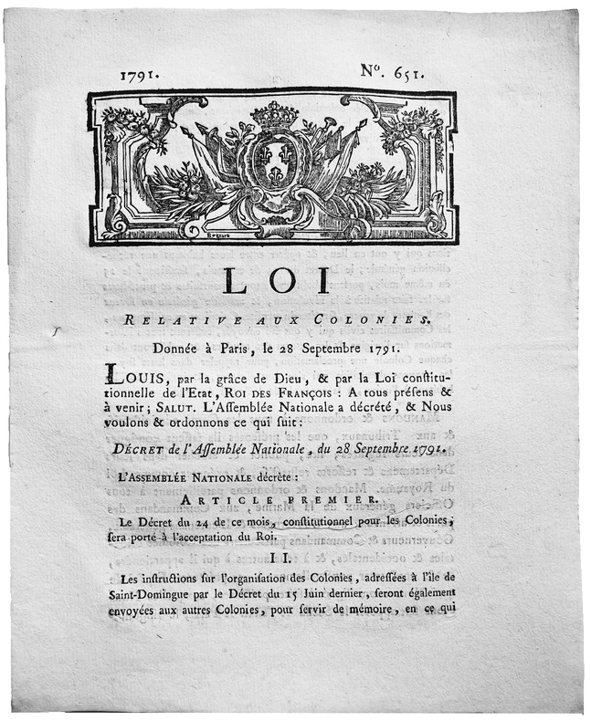 Très important texte législatif qui entérine les représentations et pressions exercées sur l'Assemblée nationale par les groupes de colons réunis en lobbies, dans les deux dispositions essentielles sur l'état des personnes de couleur : "Aucune loi sur l'état des personnes non libres ne pourra être faite par le Corps législatif pour les colonies que sur la demande formelle des assemblées coloniales". Et : "Le corps législatif ne délibérera jamais sur l'état politique des gens de couleur qui ne seraient pas nés de père et de mère libres, sans le vœu préalable, libre et spontané des colonies[...] que les gens de couleur nés de père et mère libres seront admis dans toutes les assemblées paroissiales et coloniales futures".L'exposé des motifs qui suit a été rédigé par Dupont de Nemours.Cf. Schelle, 290. - - VENTE PAR CORRESPONDANCE UNIQUEMENT