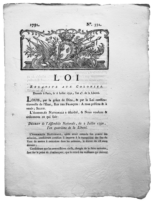 Très important texte législatif qui entérine les représentations et pressions exercées sur l'Assemblée nationale par les groupes de colons réunis en lobbies, dans les deux dispositions essentielles sur l'état des personnes de couleur : "Aucune loi sur l'état des personnes non libres ne pourra être faite par le Corps législatif pour les colonies que sur la demande formelle des assemblées coloniales". Et : "Le corps législatif ne délibérera jamais sur l'état politique des gens de couleur qui ne seraient pas nés de père et de mère libres, sans le vœu préalable, libre et spontané des colonies[...] que les gens de couleur nés de père et mère libres seront admis dans toutes les assemblées paroissiales et coloniales futures".L'exposé des motifs qui suit a été rédigé par Dupont de Nemours.Cf. Schelle, 290. - - VENTE PAR CORRESPONDANCE UNIQUEMENT