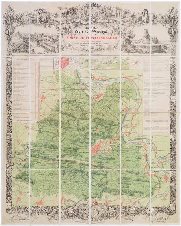 Belle carte, très décorative et détaillée, de la forêt de Fontainebleau, dressée par Claude-François Denecourt, dessinée par Charles Colinet, conducteur des Ponts et Chaussées, gravée en couleurs par Erhard Schièble, et publiée en 1887 par Lacodre Fils à Fontainebleau. Elle est ornée de deux belles vignettes montrant une vue du château et une vue du Fort de l'Empereur, construit en 1851 par Claude-François Denecourt et inauguré par Napoléon III en 1853, et aujourd'hui renommé Tour Denecourt. Au-dessus du titre figurent les armoiries de Fontainebleau, ainsi que les noms de peintres et décorateurs italiens de la Renaissance, qui firent partie de la première École de Fontainebleau. Les bordures de la carte sont décorées des armoiries des rois et reines de France ayant un lien avec la forêt, d'un médaillon contenant le portrait de Denecourt, et d'un médaillon portant l'inscription La souscription des promeneurs et des artistes. Tout autour de la carte sont disposés une petite carte itinéraire de Paris à Fontainebleau, une liste des sites et curiosités indiqués sur la carte, une légende des symboles utilisés, des observations, une situation topographique des sites les plus remarquables de la forêt, et un itinéraire des trois principales promenades de la forêt parcourables en 6 heures chacune à l'aide de voiture. Les villes sont signalées en rouge. Ancien militaire, Claude-François Denecourt contribua grandement à faire connaître la forêt de Fontainebleau, dont il écrivit les premiers guides touristiques. Considéré comme le bienfaiteur de la forêt, il traça les sentiers, marqua les itinéraires des promeneurs et créa même des grottes artificielles, des tunnels et des passages souterrains. Le "sylvain de Fontainebleau", comme le nommait Théophile Gautier, consacra quarante années de sa vie et une bonne partie de ses revenus à l’entretien de cette forêt. Il publia sa dernière carte en 1870. À sa mort en 1875, Charles Colinet, conducteur principal des Ponts et Chaussées, continua à entretenir et étendre le réseau de sentiers dans la forêt de Fontainebleau, sentiers qui portent aujourd'hui le nom de "Denecourt-Colinet". Il poursuivit la publication de la carte de la forêt de Fontainebleau, en y apportant des changements, notamment dans le tracé du polygone du champ de tir de l'école d'artillerie. Et tandis que la carte de Denecourt s'arrêtait à Chartrettes et à Achères, Colinet prolongea son édition jusqu'au château de Sainte-Assise et au Vaudoué. Bel exemplaire, sous chemise et étui de l'époque. Petites taches brunes au sommet de la carte, petits défauts d'usage à l'étui. Bulletin de la Société de l'Histoire de Paris et de l'Île-de-France, 1879, p. 60 (édition de 1879) ; Rehder, The Bradley Bibliography, A Guide to the literature of the woody plants of the world published before the beginning of the twentieth century, p. 361.