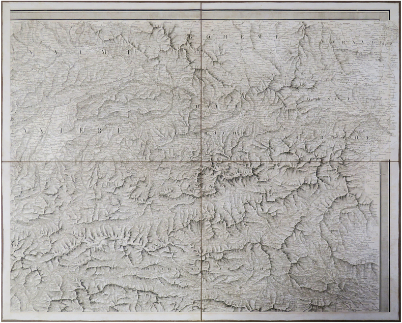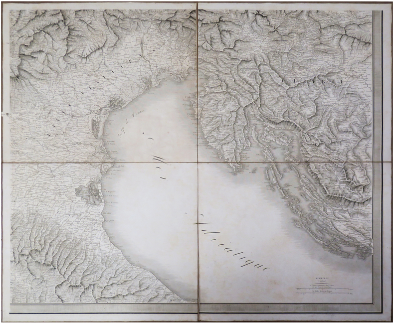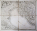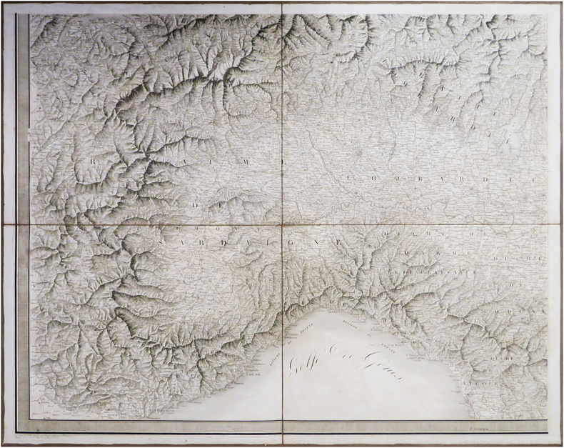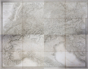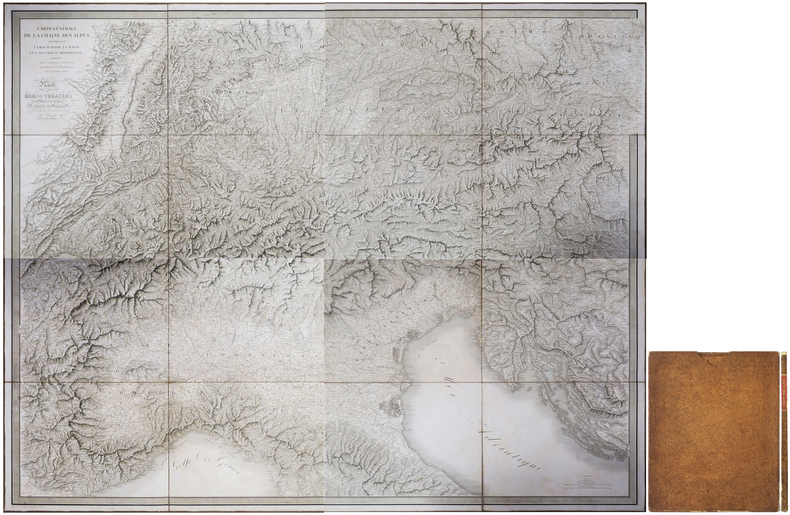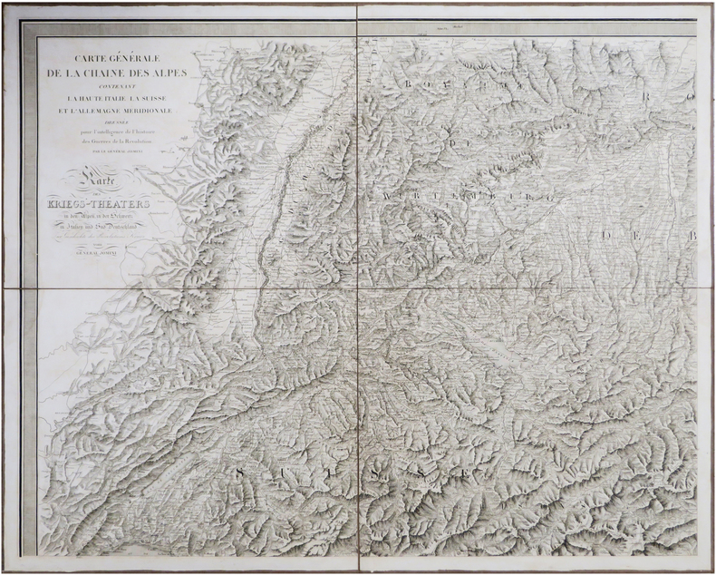Très grande carte détaillée de la chaîne des Alpes couvrant l'Italie, la Suisse et l'Allemagne, dressée par Antoine-Henri, baron de Jomini, et publiée vers 1820. Les trois premières feuilles ont été gravées par Giovanni Giacomo Orgiazzi, graveur du Dépôt Général de la Guerre. Titre en français et en allemand. Elle s'étend au nord jusqu'à Philippsburg, dans le royaume de Wurtemberg, Horazdiowitz ou Horažďovice, et Brunn ou Brno, en Bohême et Moravie, aujourd'hui Tchéquie, au sud jusqu'à Nice, Pise et Ancône, à l'ouest jusqu'à Besançon, Chambéry et Gap, et à l'est jusqu'à Vienne en Autriche et Petrinja en Croatie. D'origine suisse, le général de Jomini participa à de nombreuses campagnes napoléoniennes puis devint général en chef dans l'Armée russe du tsar Alexandre Ier. Avec Clausewitz, son contemporain, il fut l'un des meilleurs stratèges de l'époque. En 1806, il avait déjà compris comment l'Empereur Napoléon allait procéder pour abattre l'armée autrichienne, pratiquement au détail près. Bel exemplaire avec chemise et étui de papier marbré de l'époque. Défauts d'usage à la chemise et à l'étui. Aliprandi, Les Grandes Alpes dans la cartographie 1482-1885, Volume 1, 2005, pp. 230-231.