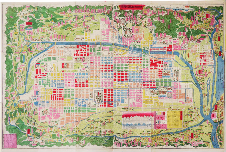 Beau plan gravé de l'ancienne ville de Meaco, aujourd'hui centre-ville de Kyoto. Le nord est situé à gauche de la carte. Bel exemplaire, replié.