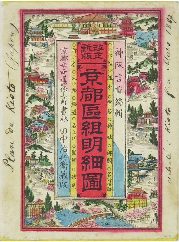 Joli plan de Kyoto dans de très beaux coloris, publié par Yoshishige Kamisaka à Tokyo vers 1885, durant l'ère Meiji, ère de l'histoire du Japon comprise entre 1868 et 1912. Ce plan, orienté vers l'est, avec le nord placé à gauche, englobe la ville de Kyoto, entourée de rivières et de canaux, ainsi que les districts autour de la ville. Il est orné de nombreuses vignettes représentant les sanctuaires, temples, châteaux et autres monuments de la ville. En bas à droite figurent un index des distances entre différents points de la ville, la légende des couleurs utilisées, et une liste des écoles primaires de la ville. Très rare exemplaire accompagné d'une chemise illustrée en couleurs, portant les inscriptions suivantes, manuscrites à l'encre : Plan de Kioto (Japon). Acheté à Kioto fin mars 1887. Bel exemplaire finement aquarellé à l'époque.