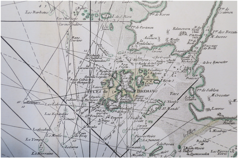 Belle carte marine figurant les côtes des Côtes d'Armor, issue du Neptune François publié vers 1820. Elle s'étend à l'ouest jusqu'à la ville de Trégastel et l'île Melban ou Malban dans l'archipel des Sept Îles, et à l'est jusqu'à Saint-Cast et le cap Fréhel, avec les îles de Bréhat, d'Er et de Gueltas. Les villes les plus importantes sont signalées à l'aquarelle rouge. La carte figure les profondeurs marines, les sables qui couvrent et découvrent, les bancs toujours couverts, les vases qui couvrent et découvrent, ainsi que les roches qui ne découvrent jamais, qui ne découvrent que dans les grandes marées, qui sont toujours découvertes et qui couvrent et découvrent. La carte est traversée de lignes de rhumbs marquant la direction des vents. La Manche est décorée d'une rose des vents, dont le nord, placé au bas de la carte, est indiqué par une fleur de lys. Édition omise par Pastoureau, publiée vers 1820, à laquelle ont été ajoutés les échelles de latitudes et de longitudes (édition de 1753), l'indication des longitudes selon les méridiens de Ténériffe, de l'île de Fer (archipel des Canaries), de Paris, de Londres et du cap Lézard ou Lizard dans les Cornouailles (édition de 1753), le cachet du Dépôt de la Marine au bas du titre, figurant une ancre marine et trois fleurs de lys (édition de 1773), ainsi que le prix en francs, unité monétaire instaurée le 15 août 1795, à la place du sol (Gazette nationale, ou le Moniteur universel, 20 août 1795, 1795, p. 1342, Titre premier). Initié par Jean-Baptiste Colbert, ministre de Louis XIV et secrétaire d'État à la Marine, le Neptune François est le premier véritable atlas nautique publié en France et entièrement dédié à la Marine. La première édition a été publiée en 1693. Leurs auteurs sont deux membres de l'Académie Royale des Sciences, Joseph Sauveur, physicien et professeur de mathématiques au Collège de France, et Jean Mathieu de Chazelles, hydrographe de la Marine. Les huit cartes des côtes de la Bretagne, levées à partir de 1675 par Denis de la Voye, ingénieur ordinaire du Roi, forment la partie la plus précieuse du recueil. Bel exemplaire aquarellé à l'époque. Brunissures dans la partie haute. Édition omise par Pastoureau ; pour les éditions antérieures, voir NEPTUNE FRANÇAIS A à D, 19 ; Bellin, Remarques sur les cartes du Neptune françois, dont les planches ont été remises au Dépôt des plans de la Marine en 1751, 1753, pp. 11-12 (pour l'édition de 1753).