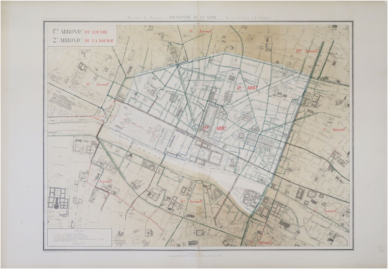 Très grand plan des 1er et 2ème arrondissements de Paris, gravé par Louis Wuhrer pour l'Atlas administratif des Eaux de la Ville de Paris, publié en 1885. Il a été dressé lors des Grands Travaux de Paris par le Service des Eaux et des Égouts, sous la direction d'Eugène Poubelle, préfet du département de la Seine de 1883 à 1896. Dissous en 1968, le département de la Seine comprenait Paris et les départements actuels des Hauts-de-Seine, de la Seine-Saint-Denis et du Val-de-Marne. Les 20 arrondissements de Paris furent quant à eux créés le 16 juin 1859, lorsque les faubourgs situés entre les fortifications de l'enceinte de Thiers et le mur des Fermiers Généraux furent annexés à Paris. Le plan indique les conduites d'eau de l'Ourcq, tracées en bleu, les conduites d'eaux de rivières, tracées en rouge, et les conduites d'eaux de source, tracées en vert. Les traits pleins indiquent les conduites situées en égout, les traits ponctués, celles situées en terre. Les bâtiments publics sont en grisé. C'est à Eugène Belgrand que l'on doit le réseau d'eau et des égouts de Paris. L'ingénieur participa à la rénovation de la capitale sous le Second Empire au côté du baron Haussmann, qui lui confia en 1854, la double mission d'approvisionner Paris en eau potable et d'assainir la Seine. Entre 1854 et 1869, le réseau d'eau augmenta de 850 km et sa longueur totale doubla. Belgrand lança un projet novateur, celui de créer deux réseaux d’alimentation en eau indépendants, l’un destiné à l’alimentation des habitants, l’autre destiné à l’alimentation des fontaines publiques, à l’embellissement et la propreté de la ville. Il devint directeur du Service des Eaux de la Ville de Paris en 1856 et mit en place le double réseau d’eau public et privé dès 1859. Puis en 1880, c'est le système du « tout-à-l’égout » qui fut décidé par le Conseil municipal de Paris, et rendu obligatoire en 1894, soit deux ans après la dernière épidémie de choléra qui avait fait 700 morts à Paris. Ce système permit une amélioration notable de l’assainissement dans la capitale, où le pourcentage d’immeubles branchés à un égout passa de 32% en 1900 à 90% en 1931. Bel exemplaire. Gougy & Giraud-Badin, Catalogue de la bibliothèque de M. Edgar Mareuse, Première partie, Vente du 10 au 28 décembre 1928, 1928, p. 122, 1400.