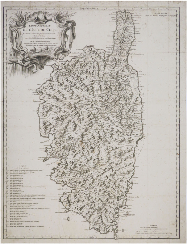 Belle et rare carte de la Corse, dressée par Didier Robert de Vaugondy, géographe du roi, et publiée par Marc Michel Bousquet à Lausanne en 1756. Elle est issue de l'ouvrage de Louis-Armand Jaussin intitulé Mémoires historiques, militaires et politiques, sur les principaux évènemens arrivés dans l'isle & royaume de Corse, depuis le commencement de l'année 1738 jusques à la fin de l'année 1741. Cette carte a été dressée d'après une carte manuscrite connue sous le nom de Carte de Maillebois. Cette carte manuscrite, considérée comme la première carte moderne de la Corse, a été exécutée par l'ingénieur Jean Bourcet de La Saigne en 1739, lors de la première intervention française dans l'île, qui se déroula entre 1738 et 1741, sous les ordres de Jean-Baptiste Desmarets de Maillebois, militaire français élevé au rang de maréchal de France en 1741. Bourcet de La Saigne était ingénieur ordinaire et aide de camp de Maillebois. Il fut nommé ingénieur-géographe puis directeur des fortifications de Corse en 1769. L'île est divisée en 10 juridictions ou pieves, et 1 fief, le fief d'Istria. En 1768, après que Gênes ait cédé la Corse à la France, de nouvelles juridictions royales seront créées par trois édits entre 1769 et 1772. En bas à gauche se trouve une légende numérotée donnant les emplacements de toutes les opérations militaires de 1739 (camps, postes génois et français, attaques et marches des troupes et maréchaux français). La carte est décorée d'un beau cartouche de titre orné d'un navire, de coquillages et poissons. Cette carte illustre l'ouvrage de Louis-Armand Jaussin intitulé Mémoires historiques, militaires et politiques, sur les principaux évènemens arrivés dans l'isle & royaume de Corse, depuis le commencement de l'année 1738 jusques à la fin de l'année 1741. Apothicaire major de l'expédition militaire placée sous le commandement du comte de Boissieux, puis du marquis de Maillebois, l'auteur participa à la campagne de pacification de la Corse en révolte contre les Génois jusqu'en 1741. Gilles (1688-1766) et Didier (1723-1786) Robert de Vaugondy, père et fils, étaient de grands éditeurs de cartes, graveurs et cartographes, actifs à Paris au milieu du XVIIIe siècle. En 1730, à la mort de Pierre Moullart-Sanson, petit-fils et héritier du célèbre cartographe Nicolas Sanson d'Abbeville, Gilles Robert de Vaugondy hérite de son vaste et prestigieux fonds cartographique, puis est nommé à son tour géographe ordinaire du roi en 1734. En 1748, en collaboration avec son fils, il publie l'Atlas portatif universel et militaire, composé de 209 cartes. En 1757, toujours en collaboration avec son fils, il publie l'Atlas Universel, l'un des atlas les plus importants du XVIIIe siècle, composé de 108 cartes. Didier, nommé géographe ordinaire du roi par Louis XV, et géographe du duc de Lorraine Stanislas Leszczynski, se consacra également à la production de globes, et publia en 1751 deux très importants globes terrestre et céleste de 45 cm de diamètre. Rare édition publiée en 1756, la même année que la première édition publiée par Robert de Vaugondy. Bon exemplaire, anciennement replié. Piqûres. Cervoni, 75.2 ; Berthelot & Ceccaldi, pp. 179-180 ; manque à Pedley.