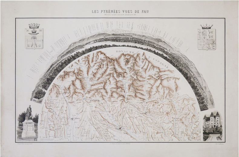Belle et curieuse carte des Pyrénées, lithographiée en trois couleurs par J. Jérôme, et publiée par Monrocq à Paris en 1890. Le paysage a été gravé par Louis Eugène Lenfant. Les altitudes sont extraites de la carte des Pyrénées dressée au 1/50,000e par le pyrénéiste Paul Édouard Wallon, ayant pour titre Carte des Pyrénées comprenant les deux versants du massif central depuis la Navarre jusqu'à la Vallée d'Aure, au 1/50,000e des Pyrénées, dont la première édition a paru en 1884. Cette carte d’une présentation peu commune s'étend depuis Pau en regardant vers le sud, et est agrémentée de l'exceptionnel panorama à 180° de la chaîne des Pyrénées, que l'on peut observer depuis la terrasse du donjon du château de Pau, situé dans le boulevard du Midi. Entre 1894 et 1899, le boulevard du Midi sera transformé par l'ingénieur Jean-Charles Alphand, et sera renommé boulevard des Pyrénées. Le panorama, signé LM, donne un aperçu de 82 pics, et s'étend d'est en ouest entre le pic d'Arneille et le pic d'Arlas. L'altitude est donnée pour chacun des pics. La carte s'étend au sud jusqu'au pic de Canaou Royo ou pic de Canaourouye, à l'ouest jusqu'à Saint-Palais, et à l'est jusqu'à Capvern. Les angles supérieurs sont décorés des armoiries de Pau et de villes du Béarn, les angles inférieurs, de vues de la statue d'Henri IV sur la place Royale à Pau, et du château de Pau. Bel exemplaire. Piqûres légères dans la marge gauche. Soulice, Catalogue de la bibliothèque de la ville de Pau, Histoire (première partie), 1900, p. 28, 158 (attribué à L. Marchal) ; Bibliographie de la France, Journal général de l'Imprimerie et de la Librairie, 22 mars 1890, 1890, p. 176, 427 ; Club alpin français, Bulletin n°35 - Juin 1894, 1894, p. 27 ; Bulletin mensuel des récentes publications françaises, Tome IX, 1890, p. 242.