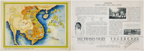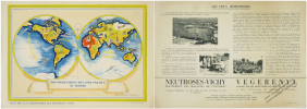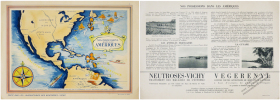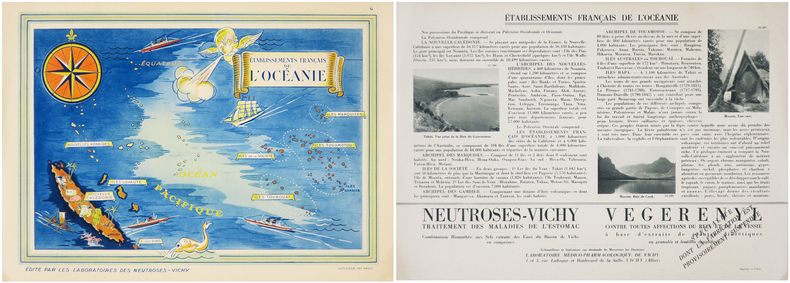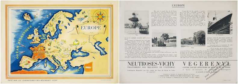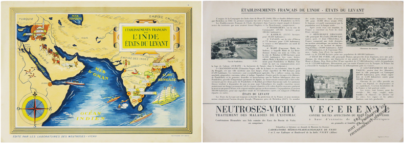 Rare ensemble bien complet, composé de huit cartes numérotées illustrant les possessions françaises dans le monde. Elles ont été imprimées par Petitjean à Paris, et publiées par les Laboratoires des Neutroses-Vichy vers 1940 : 1. Afrique Occidentale. Présente la partie nord-ouest de l'Afrique lors du gouvernement de l'A.O.F. ou Afrique-Occidentale Française, qui regroupait, au sein d'une même fédération, huit colonies françaises d'Afrique de l'Ouest entre 1895 et 1958. 2. Afrique Équatoriale F.se avec Madagascar. L'Afrique-Équatoriale française ou A.E.F., était un gouvernement général regroupant au sein d'une même fédération quatre colonies françaises d'Afrique centrale entre 1910 et 1958, dont le chef-lieu était Brazzaville. 3. Indochine. Ancien territoire de l'empire colonial français, l'Indochine regroupait le Tonkin, l'Annam et la Cochinchine, qui forment l'actuel Vietnam, le Laos et le Cambodge. La colonisation française de la péninsule indochinoise débuta en 1858 sous le Second Empire, avec l'invasion de la Cochinchine qui fut annexée en 1862, suivie de l'instauration d'un protectorat sur le Cambodge en 1863. Elle reprit à partir de 1883 sous la Troisième République, avec l'expédition du Tonkin, qui entraîna l'instauration de deux protectorats distincts sur le reste du Vietnam. Le Tonkin avait pour capitale Hanoï, la Cochinchine, Saïgon, aujourd'hui Hô-Chi-Minh-Ville. L'Indochine cessa d'être une colonie française en 1954 avec les accords de Genève, et l'indépendance du Vietnam, du Laos et du Cambodge. 4. Établissements Français de l'Inde - États du Levant. Les Établissements Français de l'Inde ou EFI comprenaient jusqu'en 1954 Pondichéry, Karikal et Yanaon sur la côte de Coromandel, Mahé sur la côte de Malabar, et Chandernagor au Bengale. Les États du Levant comprenaient la Syrie et le Liban, sous mandat français de 1923 à 1946. La carte montre également la corne de l'Afrique, la péninsule arabique, l'Irak et l'Iran, nommé Perse jusqu'en 1935. 5. Nos possessions dans les Amériques. La description de la carte cite l'Institut Pasteur de la Martinique, nommé Institut d'Hygiène et de Microbiologie jusqu'en 1938. 6. Établissements Français de l'Océanie. 7. Europe. 8. Nos possessions des cinq parties du Monde. Les possessions françaises sont mises en évidence par un dégradé brun/rouge, avec des vignettes présentant la faune, les ressources naturelles et la culture de la région. Au dos de chaque carte figure une description et des photos des pays et continents représentés. Chaque carte est accompagnée d'une serpente faisant la promotion des produits Bronchoseptol et Neutroses-Vichy. En 1910, Edmond Lauriat, pharmacien installé à Vichy, crée le Laboratoire médico-pharmacologique de Vichy, qui commercialise les Fructines-Vichy. En 1909, le succès des Fructines le conduit à emménager dans un local industriel à l’intersection de la rue Lafloque (1-3) et du boulevard de la Salle, à Vichy. En 1916, il met sur le marché les Neutroses-Vichy, pansement gastrique à base de sel de bismuth et de sels minéraux. En 1932, Edmond Potier lui succède et fonde le laboratoire Sidel qui assure la commercialisation des médicaments du groupe, Bronchoseptol des laboratoires Lauriat et Raphanus des laboratoires Potier. En 1971, le groupe est acheté par L’Oréal qui désire contrôler la marque Vichy. Bel exemplaire.