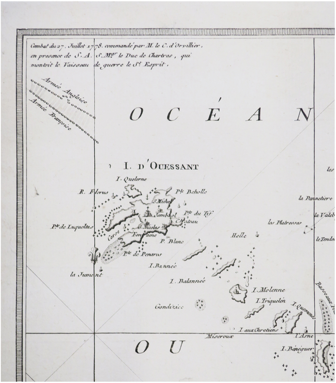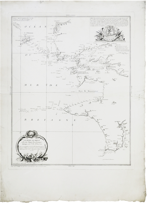 Belle et rare carte figurant les environs de la baie de Brest, dressée, gravée et publiée par Maurille-Antoine Moithey à Paris en 1778. Moithey a dressé sa carte d'après la Carte de la baie de Brest et des environs depuis Porsal jusque a Plemarcq, dressée par Lebocage ou Georges Boissaye du Bocage (1626-1696), professeur d'hydrographie au Havre, et publiée au Havre chez Jacques Gruchet en 1684. La carte couvre l'île d'Ouessant et les côtes du Finistère, entre les roches de Porsal ou Portsall au nord, et la pointe de Pennemarc ou Penmarch au sud. Cette carte donne également des informations sur la première bataille navale d'Ouessant qui se déroula le 27 juillet 1778 au large de l'île d'Ouessant, dans le cadre de la Guerre d'Indépendance des États-Unis. Dans l'angle supérieur gauche figure la note suivante : Combat du 27 juillet 1778, commandé par M. le C. d'Orvillier, en présence de S.A.S. M.gr le Duc de Chartres, qui montoit le vaisseau de guerre le S.t Esprit. Sous cette note se trouvent représentées les escadres de l'Armée Angloise et de l'Armée Françoise. Ce combat naval opposa la Grande-Bretagne à la France, alors alliée des États-Unis. L'escadre française était dirigée par le lieutenant général Louis Guillouet d'Orvilliers, et par le duc de Chartres, commandant l’arrière-garde de l’escadre de Brest sur le vaisseau le Saint-Esprit, tandis que la flotte britannique était sous les ordres de l'amiral Augustus Keppel. L'issue du combat fut indécise, mais le nombre de morts fut quatre fois plus élevé chez les Anglais. Près de la ville de Camaret figure une autre note historique : Bourg remarquable par la descente qu'y firent les Anglois le 16 juin 1694. Ils y perdirent 1200 hommes. En 1688, la France de Louis XIV alliée à l'Empire ottoman déclara la guerre à une coalition menée par les Anglais et les Hollandais dénommée ligue d'Augsbourg. La bataille de Camaret fut une tentative anglo-hollandaise, organisée en 1694, de détruire une partie de la flotte française stationnée à Brest et de débarquer une troupe d'occupation en Bretagne. Le 18juin, sous les ordres de l’amiral John Berkeley et du lieutenant-général Talsmash, une importante flotte d’invasion se présenta à Camaret pour y débarquer plusieurs milliers d’hommes. Vauban, lors de son seul commandement militaire indépendant, mit en déroute les troupes débarquées et fit échouer le projet. Près de la ville de Landevenech ou Landévennec est indiquée l'abbaye d'hommes de l'Ordre Saint Bernard par les initiales AB.H.O.S.B. La carte est décoré d'un beau cartouche de titre orné des trois fleurs de lys figurant sur le drapeau de la marine française à cette époque, d'un Neptune tenant une rame et non un trident, et d'un vaisseau. En haut à droite figure un second cartouche contenant une description de Brest, décorée d'un médaillon représentant un plan de la ville, flanqué de deux monstres marins. Au bas de ce cartouche figure la légende des symboles utilisés. Libraire, éditeur et marchand de cartes géographiques, Maurille Antoine Moithey fut nommé Ingénieur Géographe du Roi vers 1774, puis professeur de mathématiques des pages du prince et de la princesse de Conti. Il était spécialisé dans la publication de plans historiques mettant en évidence les changements urbains intervenus depuis le milieu du XVIe siècle. Il a ainsi publié des plans d'Orléans, de Reims, et de Lyon. Très bon exemplaire. Quelques traces de pliure. Gazette de France du mardi 15 décembre 1778, 1778, p. 466 ; Anthiaume, Évolution et enseignement de la science nautique en France, et principalement chez les Normands, Tome II, 1920, pp. 22-23.