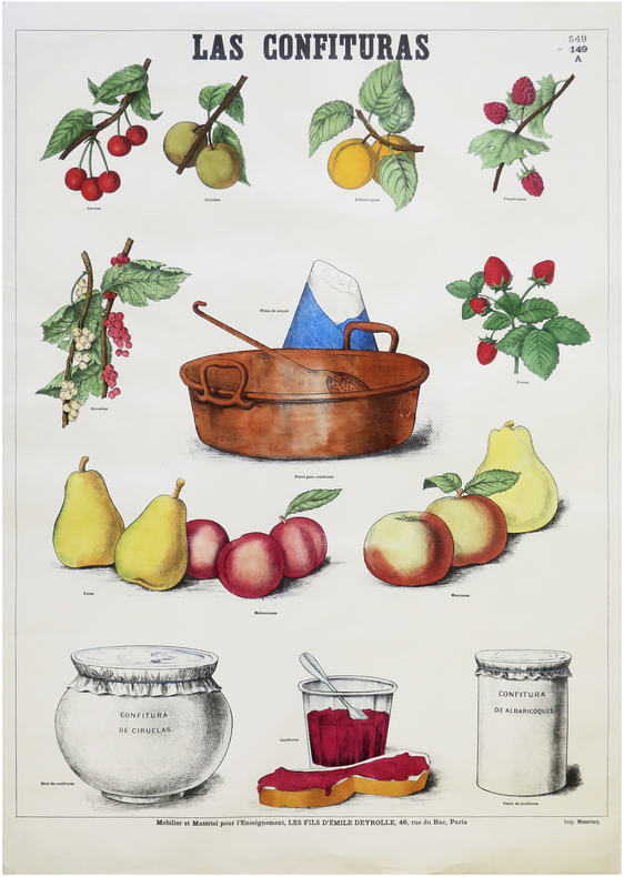 Grande et belle planche lithographiée en couleurs consacrée aux confitures, avec titre et légendes en espagnol. Cette planche fait partie de la série Tableaux muraux pour les classes maternelles, conçue par Madame Delannoy, institutrice de la Ville de Paris. Les quatorze sujets représentés sont : cerises ; prunes ; abricots ; framboises ; groseilles ; pain de sucre ; bassine à confitures ; fraises ; poires ; pêches ; pommes ; coing ; calotte à confitures ; confitures ; pot à confitures. Fondée en 1831 par Jean-Baptiste Deyrolle, la maison Deyrolle est une institution dans le domaine des sciences naturelles et de la pédagogie. Elle s'installa définitivement le 1er avril 1888 au 46, rue du Bac, sous la direction d'Émile Deyrolle, petit-fils du fondateur, rapidement relayé par son fils Achille Deyrolle. C’est vers 1871 qu’Émile Deyrolle commença à développer l'édition de planches murales colorées destinées à l’enseignement, publiées sous le nom de "Musée scolaire Deyrolle", dans des domaines aussi variés que la botanique, la zoologie, l’entomologie, la géographie, l’anatomie humaine, l’instruction civique, la physique, la chimie, la géologie, la minéralogie, la biologie, etc. Dès les années 1870, plusieurs centaines de sujets sont déjà traités et l'État devient le principal client de la Maison. Deyrolle devient alors le premier fournisseur de l'Instruction publique et équipe les écoles de ses planches pédagogiques. Ces planches traverseront même les frontières et seront notamment traduites en espagnol, portugais, anglais et arabe. Les planches en langue espagnole ou portugaise étaient éditées spécialement pour l'Amérique centrale et l'Amérique du Sud (Les Fils d'Émile Deyrolle, Fabrique de mobilier et de matériel scolaires pour les enseignements maternel, primaire, secondaire et supérieur, Septembre 1898, p. 32). Bel exemplaire. Les Fils d'Émile Deyrolle, Mobilier et matériel scolaires, Octobre 1925, p. 13, 149 (pour l'édition en français).