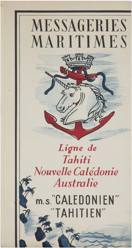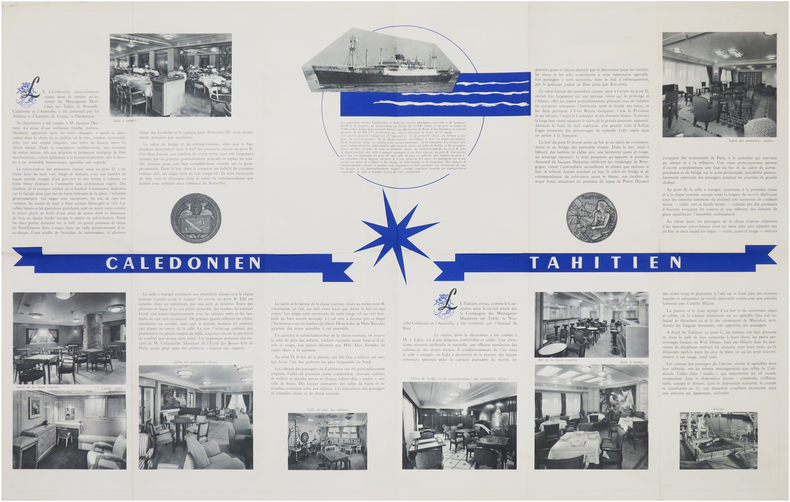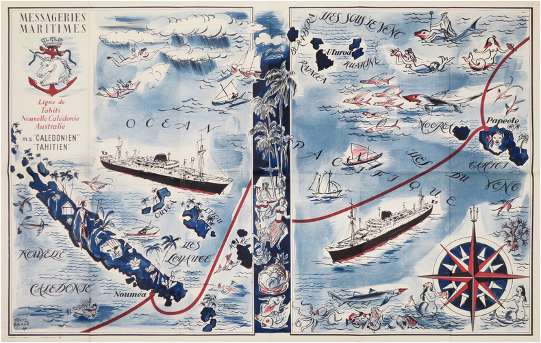 Très beau dépliant touristique, illustré et dessiné par Hervé Baille pour la Compagnie des Messageries Maritimes. Il a été imprimé par Chavane à Paris. La Compagnie des Messageries Maritimes est une compagnie maritime française fondée en 1851 par Albert Rostand, armateur marseillais. Elle assurait deux types de lignes: des lignes commerciales, avec le transport de passagers et de marchandises ; et des lignes subventionnées par l'État, avec le transport du courrier et de "passagers de l'État". Elle a disparu en 1975, lors de sa fusion avec la Compagnie Générale Transatlantique, pour devenir la Compagnie Générale Maritime. Le présent dépliant est dédié aux lignes de la compagnie maritime assurées par les deux navires jumeaux le Calédonien et le Tahitien, au départ de Marseille vers Nouméa en Nouvelle-Calédonie, Papeete à Tahiti et Sidney en Australie, dans l'océan Pacifique. L'abréviation "m.s." dans le titre ou "motor ship" désigne un navire propulsé par un moteur à combustion interne. Le Calédonien, construit par les Ateliers et Chantiers de France à Dunkerque, fut achevé en septembre 1952, et effectua son voyage inaugural entre Marseille et Sidney via le canal de Panama le 1er octobre de la même année. Il fut renommé Nisos Kypros en 1972, puis démantelé en 1975. Le Tahitien, construit par l'Arsenal de Brest, fut achevé le 4 octobre 1952, et effectua son voyage inaugural le 4 mai 1953 entre Marseille et Sidney via le canal de Panama. Il fut renommé Atalante en 1972. Au recto du dépliant se trouve une belle carte en couleurs du Pacifique, décorée d'une grande rose des vents et de belles illustrations de la faune et de la flore, de personnages, dont un Neptune et une sirène sonnant la conque marine, et de représentations des deux paquebots. Le titre est orné du logo de la compagnie, figurant une licorne posée sur une ancre couronnée. Au dos se trouvent des descriptions des deux paquebots, accompagnées de photographies. Dessinateur et graveur français, Hervé Baille (1896-1974) fut nommé en 1947 peintre officiel de la Marine. Dans les années 40, la compagnie Air France fait appel à lui pour illustrer ses affiches et prospectus. En 1960, il crée, en association avec Luc-Marie Bayle, également peintre officiel de la Marine, la société d'édition publicitaire 2B (Bayle et Baille, Baille et Bayle). Pendant douze ans, de 1960 à 1972, ils composent des aquarelles et des illustrations avec des personnages dessinés un peu à la manière de Penet. Baille initie son ami à l'art de la mise en page et à la typographie, et lui transmet aussi le goût de la précision et de la pureté du trait (Cols Bleus, Hebdomadaire de la Marine et des Arsenaux, N°2515 du 29 janvier 2000, Luc-Marie Bayle, génial touche-à-tout, par Anne Pavard, p. 11). Bel exemplaire. Kludas, Great passenger ships of the world, Volume 5 1961-1976, 1977, Messageries Maritimes Liners, p. 60.