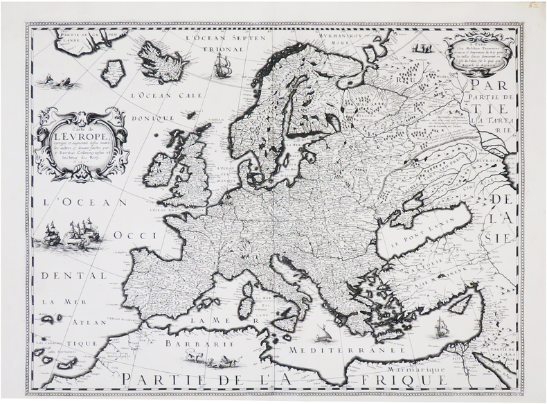 Très belle et rare carte de l'Europe, dressée par Petrus Bertius. Elle est issue de la première édition du Théâtre géographique du Royaume de France de Melchior Tavernier, publiée en 1632. Elle est décorée d'un cartouche de titre, de six navires, et d'un monstre marin. Le nord de l'Afrique et la Russie sont décorés de deux vignettes. Cette rare carte fait partie d'un ensemble de quatre cartes des continents, publiées par Melchior Tavernier dans le Théâtre géographique du Royaume de France, une première fois en 1632, puis en 1634, 1637, 1638 et 1643. Né en Flandre en 1565, Petrus ou Pierre Bertius était un mathématicien et cartographe néerlandais. Obligé de fuir son pays en raison de troubles politiques et religieux, il s'installa à Paris, et fut nommé en 1618 cosmographe du roi Louis XIII. Graveur, imprimeur et hydrographe du roi, Melchior Tavernier, frère du célèbre voyageur Jean-Baptiste, fut à l'origine du développement de la cartographie française gravée du XVIIe siècle. Son Théâtre géographique du royaume de France est l'un des atlas français les plus importants du XVIIe siècle. Bel exemplaire. Pastoureau, Les Atlas français XVIe – XVIIe siècles, TAVERNIER II A, 2.