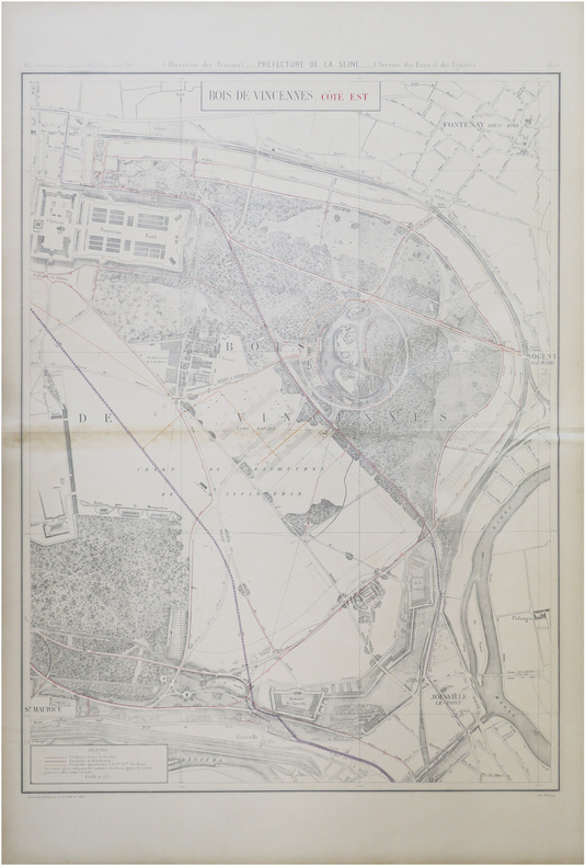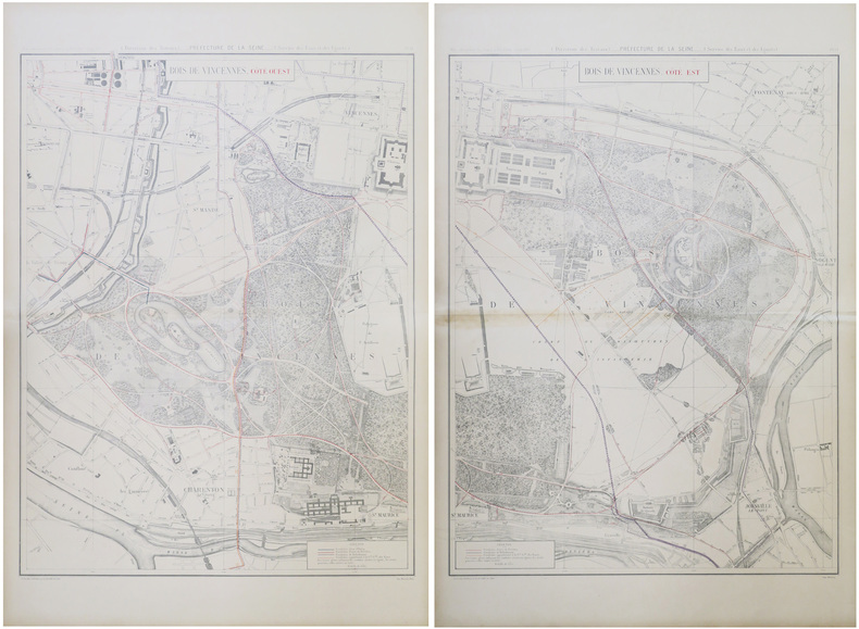 Très grand et beau plan en deux feuilles du Bois de Vincennes, gravé par Louis Wuhrer pour l'Atlas administratif des Eaux de la Ville de Paris, publié en 1885. Il a été dressé lors des Grands Travaux de Paris par le Service des Eaux et des Égouts, sous la direction d'Eugène Poubelle, préfet du département de la Seine de 1883 à 1896. Dissous en 1968, le département de la Seine comprenait Paris et les départements actuels des Hauts-de-Seine, de la Seine-Saint-Denis et du Val-de-Marne. Le plan indique, pour la partie ouest du bois, les conduites d'eaux de rivières, tracées en rouge, les conduites de refoulement, tracées en mauve, et les conduites appartenant à la Compagnie Générale des Eaux, tracées en orangé ; pour la partie est, les conduites d'eaux de l'Ourcq, tracées en vert, les conduites d'eaux de rivières, tracées en rouge, les conduites de refoulement, tracées en mauve, et les conduites appartenant à la Compagnie Générale des Eaux, tracées en orangé. Les traits pleins indiquent les conduites situées en égout, les traits ponctués, celles situées en terre. La Compagnie Générale des Eaux de Paris fut créée par Napoléon III en 1860. Après le bois de Boulogne, cédé par Napoléon III à la Ville de Paris en 1852, et aménagé par le baron Haussmann et Jean-Charles Alphand, le bois de Vincennes devient la propriété de la Ville de Paris en 1860. Il est lui aussi aménagé à partir de cette date à la demande de Napoléon III, qui souhaite offrir une grande promenade aux populations laborieuses des XIIe et XIIIe arrondissements, et aux ouvriers du faubourg Saint-Antoine. Comme on peut le voir, Alphand le transforme en parc anglais, et y aménage quatre lacs : le lac des Minimes et ses trois îles, le lac Daumesnil et ses deux îles nommées Bercy et Reuilly, le lac de Gravelle et le lac de Saint-Mandé. Dans l'enceinte du bois, on peut voir le polygone de l'artillerie, où s'exerçaient les artilleurs, le champ de manœuvres de l'infanterie, les batteries, les redoutes, les buttes pour le canon et pour la mousqueterie, l'arsenal, la salle d'artifices, la cartoucherie, les ateliers d'emplombage, l'Hôpital Militaire, bâti en 1855, le château avec son donjon et son église, le nouveau fort (l’un des seize forts détachés de l’enceinte de Thiers, construit entre 1842 et 1847, aujourd'hui renommé Fort Neuf de Vincennes), l'Asile National, précédemment Asile Impérial, qui accueillait les nombreux ouvriers blessés lors des Grands Travaux, et devenu l'Hôpital National de Saint-Maurice en 1992, et la Maison de Santé pour le traitement des aliénés. Le plan montre également les communes de Saint-Mandé, Vincennes, Charenton-le-Pont, Saint-Maurice et Joinville-le-Pont. Dans Saint-Mandé, on peut voir l'École municipale d'arboriculture, créée par le préfet Haussmann en 1867, ici nommée École pratique d'arboriculture, l'hospice Saint-Michel et l'hospice Lenoir et Jousserand, ouvert en 1880, et le Dépôt des tramways de la Compagnie des Omnibus ; dans la commune de Vincennes, la gendarmerie, le Dépôt des tramways de la Compagnie des Omnibus et l'école des Fours ; dans Saint-Maurice, la Maison de Santé. À l'est du bois, on peut voir les bastions 4 à 10 de l'enceinte de Thiers, du nom de l'homme politique qui conçut le projet. Construite entre 1841 et 1844, l'enceinte était constituée de 94 bastions, et englobait non seulement Paris mais aussi les communes environnantes annexées à Paris en 1859, telles Montmartre, La Villette, Belleville, Charonne, Bercy, Auteuil, ou encore Passy. C'est à Eugène Belgrand que l'on doit le réseau d'eau et des égouts de Paris. L'ingénieur participa à la rénovation de la capitale sous le Second Empire au côté du baron Haussmann, qui lui confia en 1854, la double mission d'approvisionner Paris en eau potable et d'assainir la Seine. Entre 1854 et 1869, le réseau d'eau augmenta de 850 km et sa longueur totale doubla. Belgrand lança un projet novateur, celui de créer deux réseaux d’alimentation en eau indépendants, l’un destiné à l’alimentation des habitants, l’autre destiné à l’alimentation des fontaines publiques, à l’embellissement et la propreté de la ville. Il devint directeur du Service des Eaux de la Ville de Paris en 1856 et mit en place le double réseau d’eau public et privé dès 1859. Puis en 1880, c'est le système du « tout-à-l’égout » qui fut décidé par le Conseil municipal de Paris, et rendu obligatoire en 1894, soit deux ans après la dernière épidémie de choléra qui avait fait 700 morts à Paris. Ce système permit une amélioration notable de l’assainissement dans la capitale, où le pourcentage d’immeubles branchés à un égout passa de 32% en 1900 à 90% en 1931. Bel exemplaire. Pour la seconde feuille, papier aminci à la pliure centrale, et partie basse brunie. Vallée, Catalogue des plans de Paris, 1908, p. 61, 326 & 328.