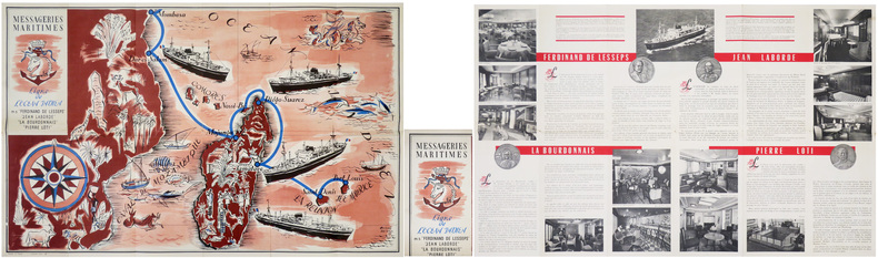 Très beau dépliant touristique, illustré et dessiné par Hervé Baille pour la Compagnie des Messageries Maritimes. Il a été imprimé par Chavane à Paris. La Compagnie des Messageries Maritimes est une compagnie maritime française fondée en 1851 par Albert Rostand, armateur marseillais. Elle assurait deux types de lignes: des lignes commerciales, avec le transport de passagers et de marchandises ; et des lignes subventionnées par l'État, avec le transport du courrier et de "passagers de l'État". Elle a disparu en 1975, lors de sa fusion avec la Compagnie Générale Transatlantique, pour devenir la Compagnie Générale Maritime. Le présent dépliant est dédié aux lignes de la compagnie maritime assurées par les quatre navires jumeaux Ferdinand de Lesseps, Jean Laborde, La Bourdonnais, et Pierre Loti, au départ de Marseille vers les îles de Madagascar, La Réunion et Maurice, dans l'océan Indien. L'abréviation "m.s." dans le titre ou "motor ship" désigne un navire propulsé par un moteur à combustion interne. Le Ferdinand de Lesseps, construit par les Chantiers de la Gironde, fut achevé en 1952, et effectua son voyage inaugural entre Marseille et Port-Louis le 3 octobre de la même année. Il fut renommé Delphi en 1969. Le La Bourdonnais, construit par l'Arsenal de Lorient, fut achevé en 1953, et effectua son voyage inaugural le 31 mars. Il fut renommé Knossos en 1968. Le Pierre Loti, achevé en 1953 par l'Arsenal de Brest, effectua son voyage inaugural le 17 juillet. Il fut renommé Olympia en 1970, puis Patra en 1972. Enfin le Jean Laborde, également construit par les Chantiers de la Gironde, fut achevé en 1953 et effectua son voyage inaugural le 31 juillet. Il fut renommé Mykinai en 1970, puis porta trois autres noms jusqu'en 1976. Les quatre paquebots assuraient la liaison entre Marseille et Port-Louis à l'Île Maurice, via Mombasa au Kenya, Dar es Salam en Tanzanie, Diego-Suarez ou Antisiranana, l'île de Nosy Be, Majunga et Tamatave ou Toamasina à Madagascar, et Saint-Denis de La Réunion. Au recto du dépliant se trouve une belle carte en couleurs de l'océan Indien depuis Mombasa au Kenya, jusqu'à l'Île Maurice, décorée d'une grande rose des vents et de belles illustrations de la faune et de la flore, de personnages, et de représentations des quatre paquebots. Le titre est orné du logo de la compagnie, figurant une licorne posée sur une ancre couronnée. Au dos se trouvent des descriptions des quatre paquebots, accompagnées de photographies. Il existe une autre version de ce dépliant, dessinée et illustrée par Desruol, dont le texte est en langue anglaise. Dessinateur et graveur français, Hervé Baille (1896-1974) fut nommé en 1947 peintre officiel de la Marine. Dans les années 40, la compagnie Air France fait appel à lui pour illustrer ses affiches et prospectus. En 1960, il crée, en association avec Luc-Marie Bayle, également peintre officiel de la Marine, la société d'édition publicitaire 2B (Bayle et Baille, Baille et Bayle). Pendant douze ans, de 1960 à 1972, ils composent des aquarelles et des illustrations avec des personnages dessinés un peu à la manière de Penet. Baille initie son ami à l'art de la mise en page et à la typographie, et lui transmet aussi le goût de la précision et de la pureté du trait (Cols Bleus, Hebdomadaire de la Marine et des Arsenaux, N°2515 du 29 janvier 2000, Luc-Marie Bayle, génial touche-à-tout, par Anne Pavard, p. 11). Bel exemplaire. Kludas, Great passenger ships of the world, Volume 5 1961-1976, 1977, Messageries Maritimes Liners, pp. 53-57.