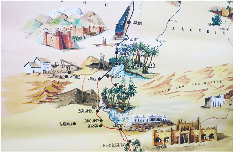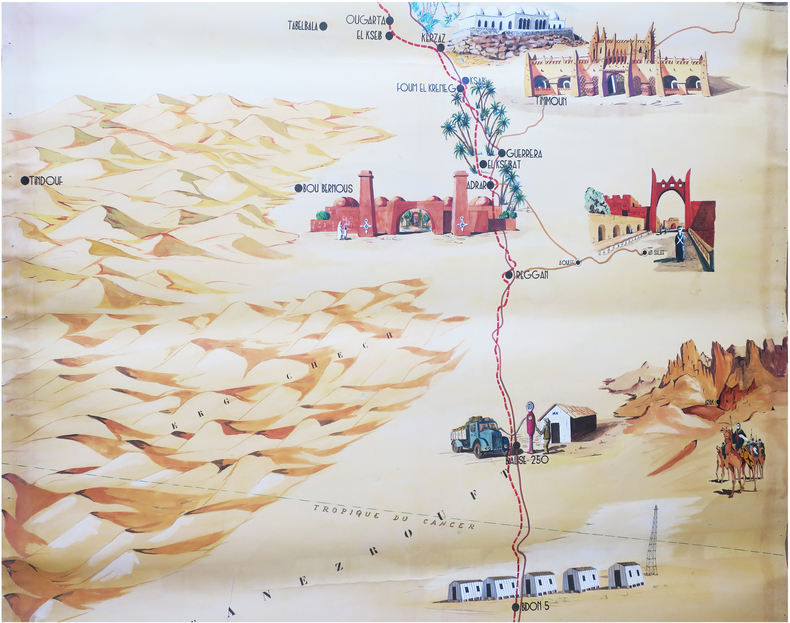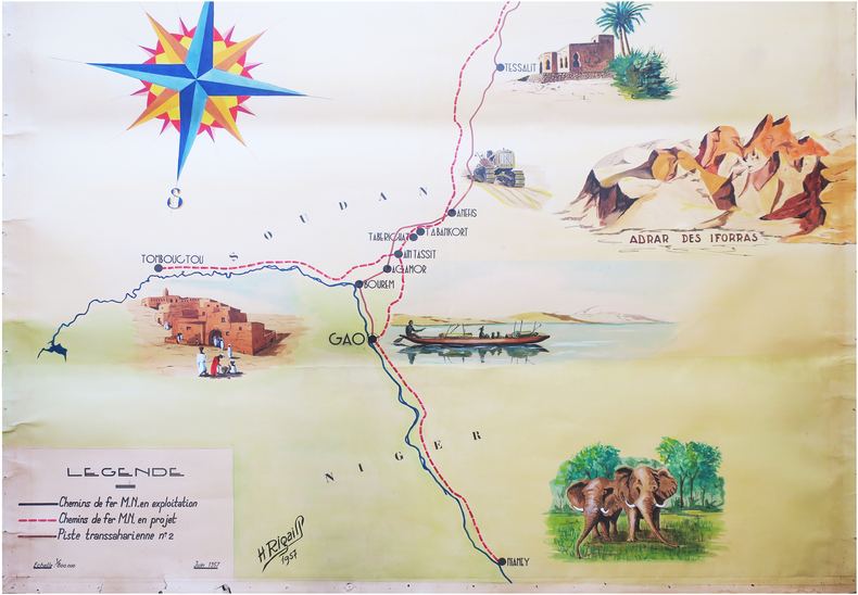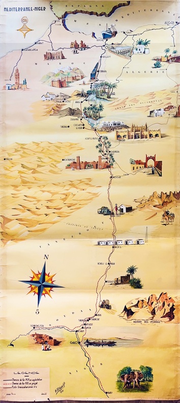Très grande et spectaculaire aquarelle illustrant le projet d’une ligne de chemin de fer entre l’Algérie et le Niger. Réalisée au 1/800 000e, elle comprend une vingtaine de dessins aquarellés montrant des sites pittoresques d’Algérie, du Maroc et du Mali : Laghouat, Saïda, Meknès, Colomb-Béchar (actuellement Béchar), Timimoun, Ain Salah, Tessalit, Adrar des Iforas, etc. Elle comporte une rose des vents ainsi qu’une légende inscrite dans un cartouche dans l’angle inférieur gauche. La partie de la ligne déjà en exploitation, située entre Nemours (actuellement Ghazaouet, Algérie) et Abadla (à 90 km au sud-ouest de Colomb-Béchar), est représentée par un trait noir; celle en projet, qui doit traverser le Sahara entre Abadla et Niamey (Niger), est mentionnée par un tireté rouge; un trait marron donne le tracé de la piste transsaharienne n° 2. Au départ de Nemours, la ligne déjà construite se dirige vers le sud, emprunte la ligne Alger-Meknès-Casablanca, traverse la frontière marocaine, passe par Oujda (Maroc), puis se sépare de cette dernière pour prendre la direction du sud marocain: Berguent, Tendrara, Tamelt, Mengoub, Menahba, Talzaza, puis revient en Algérie pour passer par Colomb-Béchar et Abadla, la dernière localité desservie par le chemin de fer existant. Vient ensuite la partie en projet: à partir d’Abadla, la ligne prend la direction du sud et passe par Zerhamra (au sud-ouest de Beni Abbès), Ougarta, El Kseib, Kerzaz, Ksabi, Adrar, Reggane, Balise 250, Bidon 5, Bordj le Prieur. Elle passe ensuite au Soudan (le Mali actuel): Anefis, Tabankort, Taberichat, Ain Tassit. Elle se divise alors en deux branches, l’une se dirigeant vers Tombouctou (Mali), et l’autre vers Gao (Mali) et Niamey (Niger). Cette ligne passe à proximité de la piste transsaharienne n° 2, qui s’étend de Colomb-Béchar à Gao. Le chemin de fer transsaharien, ou chemin de fer Méditerranée-Niger, était un projet de traversée ferroviaire entre l’Afrique du Nord et l’Afrique occidentale française (AOF). Imaginé dès la seconde moitié du XIXe siècle, il fut interrompu en 1881 après l’attaque de la seconde mission Flatters. Relancé en 1939, il fut continué par le gouvernement de Vichy, puis par le gouvernement provisoire, avant d’être clos définitivement en 1949, la ligne s’arrêtant au barrage d’Abadla. Apparemment inédite, la présente aquarelle, réalisée vraisemblablement par Hippolyte Rigaill, témoigne d’une tentative de reprise du projet, peu avant l’indépendance des anciennes colonies françaises. Dans le Courrier du Maroc du 14 avril 1952, Hippolyte Rigaill est mentionné comme dessinateur, et comme membre du conseil municipal de la région d'Oujda. Dans celui du 3 avril 1953, on apprend qu'il participa à une exposition d'artistes locaux au grand hall des Services Municipaux : "notre ami Rigaill aime la mer et les grands espaces. Aussi est-ce une majorité de marines et de paysages, de dunes et de visages marocains qu'il présente à notre admiration. Peut-on lui reprocher de peindre sans artifice, de reproduire les choses telle qu'il les voit : avec beaucoup de soleil". Document d'une fraicheur et d'une taille exceptionnelle.