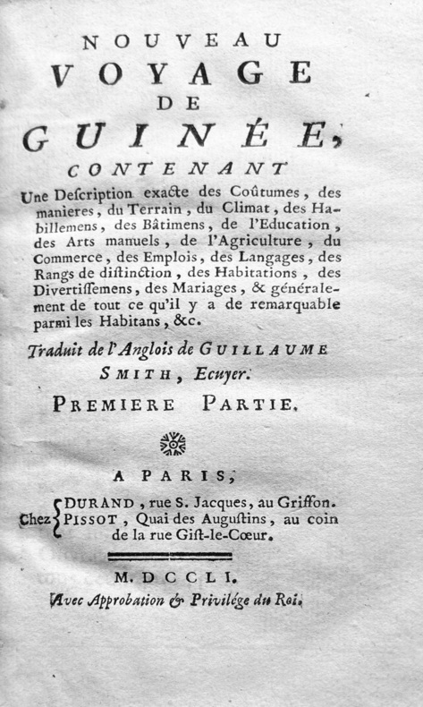 Édition originale de la traduction française de cette relation estimée, illustrée de 15 figures tirées sur 5 planches dépliantes. L'édition originale anglaise est de 1744. Missionné par la Royal African Company, Smith séjourna pendant toute l'année 1726 dans le Golfe de Guinée, pour lever les plans des forts de la compagnie. Il en profita pour étudier les moeurs des habitants, la faune et la flore de la région. Il remarque que les petits royaumes peuplant cette côte vivent en bonne intelligence, qu'ils se font rarement la guerre, et qu'en conséquence faute de prisonniers, le commerce des esclaves y est peu pratiqué. (Sabin, 84561) P1-3K
