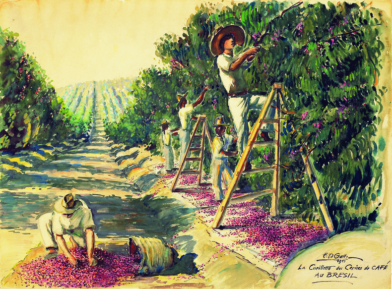 On trouve ainsi représenté le processus : - La cueillette des cerises de café - Le ramassage des cerises de café dans les grands draps - La cueillette du café - Le séchage mis en tas des cerises de café - Pesage et entassage du café La production de café au Brésil représente environ un tiers de la production mondiale de café, ce qui fait du Brésil, le plus grand producteur du monde. Les plantations de café couvrent environ 27000km2 de terrain, principalement dans les États du sud (Minas Gerais, São Paulo et Paraná) où l'environnement et le climat offrent des conditions de croissance idéales. Le café est arrivé au Brésil au XVIIIesiècle et le pays est devenu le premier producteur dans les années 1840. L'apogée de la production brésilienne se situe dans les années 1920 quand le pays fournissait 80% du café du monde. Bon état de conservation.