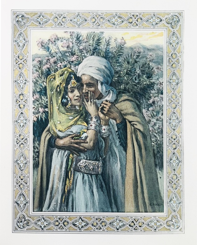 Ouvrage illustré d'ornements et d'encadrements à chaque page, et de 50 compositions en couleurs et or d'Édouard Dinet. Tirage à 300 exemplaires. Un des 260 sur papier vélin à la cuve (n°220), enrichi du prospectus de l'ouvrage, reprenant la couverture, un frontispice et une illustration. Exemplaire à l'état de neuf dans une élégante reliure signée. Carteret, 140 : "C'est le plus rare des ouvrages de Dinet".