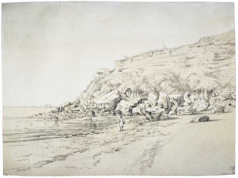La côte libanaise au moment de l’Expédition de Syrie. Il montre, au premier plan, un personnage se déplaçant près du rivage et se dirigeant vers l’artiste. Au second plan apparaît une falaise d’où se sont détachés d’immenses blocs de pierre accumulés en contrebas. Deux personnages sont représentés : une femme, penchée, semble s’occuper d’un animal et un homme, assis sur un rocher, tient un fusil. A l’arrière-plan, on aperçoit deux constructions qui pourraient correspondre à un fort assurant la défense de la côte. Peintre orientaliste et officier de marine, Prosper Halvor Henri Oscar Romieux, dit Osmond Romieux, naquit à La Rochelle en 1826. Entré à l’Ecole navale en 1841, il effectua, de 1844 à 1847, un voyage en Polynésie d’où il ramena de nombreux dessins. Promu lieutenant de vaisseau en 1854, il fit partie du corps expéditionnaire envoyé en Syrie en 1860 et réalisa plusieurs aquarelles du Liban. Capitaine de frégate en 1867, il cessa ses fonctions en 1881 et mourut à La Rochelle en 1908. Sur Romieux et ses carnets de dessins, cf. KHOURY (Gérard D.), Le voyage d’Osmond Romieux au Levant: Beyrouth et le Mont-Liban, 1860-1861, Catalogue d’exposition au Musée d’histoire de Marseille, 22 avril-30 août 2010. Bon état de conservation.