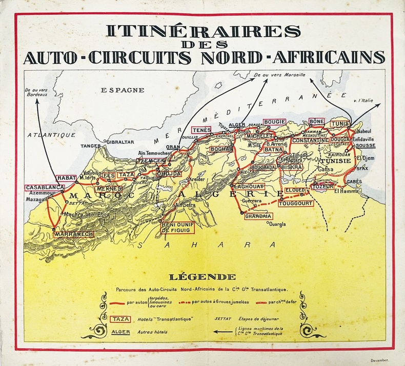 Plaquette publicitaire illustrée d'une couverture en couleurs de Jeanne Thil au recto, d'une carte des itinéraires en couleurs au verso, et de 40 illustrations dans le texte d'après des photographies. Le texte, établi par Georges Rozet, donne des informations sur les 22 circuits proposés, sur les conditions de voyages avec des conseils pratiques, ainsi que la liste des hôtels. Dès 1919, le président de la Compagnie Générale Transatlantique John Dal Piaz fut à l’origine des premiers Auto-Circuits Nord-Africains. Ce projet touristique donnait la possibilité de parcourir en voiture Renault les territoires d’Algérie, du Maroc et de Tunisie, et de loger dans des hôtels de luxe. Bon exemplaire de cette plaquette peu commune. Petits frottements à la couverture.