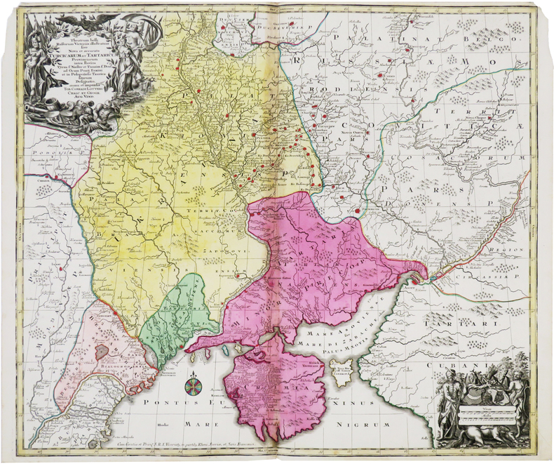 Belle et rare carte figurant les pays situés au nord de la mer Noire, illustrant le conflit qui opposa l'Empire russe à l'Empire ottoman entre 1735 et 1739. Elle a été publiée vers 1760 par Tobias Conrad Lotter, gendre et successeur de Matthäus Seutter. Cette carte s'inspire de celle du cartographe français Joseph Nicolas de l'Isle (1688-1768), intitulée « Theatrum Belli A.o MDCCXXXVII a milite Augustæ Russorum Imperatricis adversus Turcas Tattarosque gesti ». Invité à la cour de Saint-Pétersbourg, de l'Isle collabora étroitement avec l'Académie des Sciences de la ville à l'élaboration de nombreuses cartes, dont certaines relatives à la zone de conflit durant la guerre russo-turque de 1735-1739. De l'Isle réalisa cette carte pendant la guerre, décrivant le théâtre des opérations en Ukraine. Comme sur la carte de de l'Isle, celle de Lotter montre la Ligne d'Izium, ou « Ligne ukrainienne », un ensemble de fortifications à la frontière avec les Tatars, s'étendant du Dniepr à la ville d'Izium sur le Don. L'itinéraire emprunté le long du Dniepr par le maréchal russe, le baron von Munnich, est illustré, de même que la marche de l'armée du général Peter Lacy, deux opérations qui se soldèrent par des victoires à la Pyrrhus en Crimée. Nemirow (Nemyriv) est identifiée comme le lieu des négociations diplomatiques infructueuses de 1737, avec la mention latine «Legatorum Congressus1737 » signifiant réunion des ambassadeurs. Le lieu d'exil des Cosaques zaporogues près de la rivière Kamenka (Novaja Setsh), ainsi que la sitch (région cosaque) originelle (Saporoger Setsh), abandonnée après la défaite cosaque de Poltava mais où les Cosaques revinrent en 1734 avant la guerre, sont également représentés. La carte est décorée d'un beau cartouche de titre orné des portraits de Mars, dieu de la Guerre, de Thémis, déesse de la Justice, et de Philophrosyne, déesse de la Bienveillance. À leurs pieds se tiennent des captifs enchaînés. En bas à droite figure un second cartouche pour l'échelle des distances, orné de deux portraits dont un soldat Cosaque. La carte est orientée par une rose des vents. La première édition a été publiée par Matthäus Seutter en 1739. Conrad Lotter, gendre et successeur de Matthäus Seutter à partir de 1740, est l'un des plus célèbres cartographes allemands du XVIIIe siècle. Très bon exemplaire brillamment aquarellé à l'époque. Pliure centrale légèrement brunie, manque dans les angles supérieurs. Kordan, The Mapping of Ukraine, European cartography and maps of early modern Ukraine, 1550-1799, An Exhibition from the archives of the Ukrainian Museum and private collections, 35.