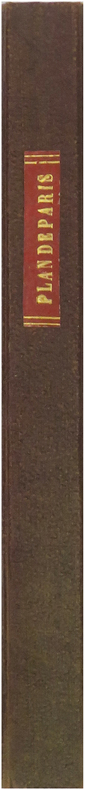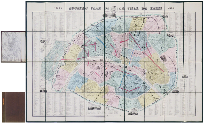 1857 un plan dépliant , reliure demi-toile d'époque cartonnée in- douze (cloth-bound duodecimo) Editeur (15,5 x 9,5 cm), couverture recouverte d'un papier peigné, dos muet (spine without title) avec manque de papier (lake of paper), 1ère de couverture orné d'une étiquette blanche, titre imprimé en noir dans un encadrement de double filet noir, Ex-Libris : "Me La Comtesse de Quatrebarbes Paris 31 Juillet 1857" manuscrit à l'encre brune, plan déplié Format : 60 x 87 cm, ce plan emploie un système nouveau : " Méthode Zugenbuhler" avec les noms de rues, les Ministères, les Bibliothèques, Les Théatres...les fortifications de paris sont colorées en orangé, les forts en vert et rouge, l'Image de certains monuments apparaissent gravés en noir en médaillons, le plan est réhaussé de couleurs par secteurs, 1857 Paris Chez P. Marie et A. Bernard Editeurs,