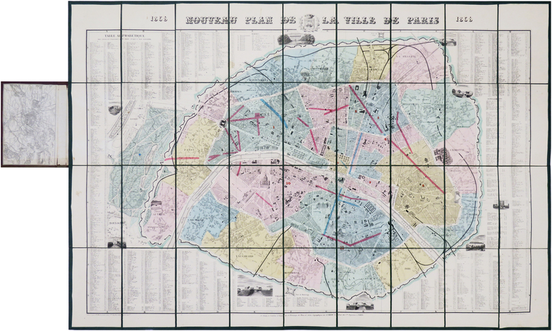 Paris, A. Corion, 1858. En 36 sections montées sur toile vert bouteille et repliées, formant un plan de 646 x 940 mm, monté dans une reliure de chagrin marron avec pièce de titre rouge au dos ; carte des environs de Paris contrecollée au dos du premier plat.
