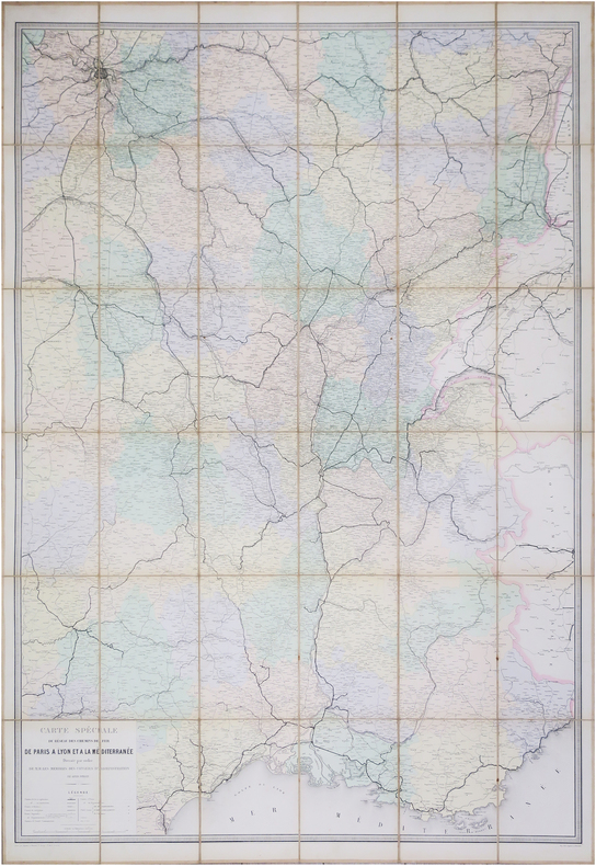 Très rare et belle carte murale figurant le réseau ferroviaire de la Compagnie des chemins de fer de Paris à Lyon et à la Méditerranée, dressée en 1869 par Alfred Potiquet, ingénieur civil. Elle a été lithographiée par Auguste Régnier et Charles Dourdet, et finement coloriée à l'époque. Elle s'étend au nord jusqu'à Metz, à l'ouest jusqu'à Brives, et à l'est jusqu'à Turin et Monaco. Les chemins de fer en exploitation sont indiqués par des traits pleins en bleu, les chemins de fer en construction par des traits ponctués en bleu. La carte représente également les canaux de navigation, les routes impériales et départementales, et les chemins de grande communication. La Compagnie des chemins de fer de Paris à Lyon et à la Méditerranée, fut l'une des plus importantes compagnies ferroviaires privées françaises jusqu'à sa nationalisation en 1938, lors de la création de la S.N.C.F. Communément désignée sous le nom de Paris-Lyon-Méditerranée ou son sigle PLM, elle fut fondée en 1857 par Paulin Talabot, ingénieur polytechnicien qui contribua à l’essor du chemin de fer en France et à l’étranger. Elle était constituée de la fusion de deux compagnies créées en 1852, la Compagnie du chemin de fer de Lyon à la Méditerranée et la Compagnie du chemin de fer de Paris à Lyon. Desservant le sud-est de la France, et notamment la Côte d’Azur, avec par exemple la ligne de Toulon à Nice, mais aussi la Provence, les Cévennes et les Alpes, elle était la compagnie par excellence des départs en villégiature. La gare parisienne du PLM était la gare de Lyon. Très rare. Nous n'avons trouvé aucun exemplaire dans les collections publiques. Bel exemplaire finement colorié à l'époque.