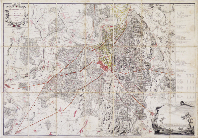Belle carte particulièrement détaillée de la forêt de Fontainebleau, dressée en 1778 et gravée par Guillaume-Nicolas Delahaye. L'exemplaire a été finement aquarellé à l'époque. De plus, les lettres du titre et un grand nombre de toponymes ont été surlignés à l'aquarelle rouge. La carte s'étend au nord jusqu'à Vaux-le-Pénil et Melun, au sud jusqu'à Grés ou Grez-sur-Loing, et Villiers ou Villiers-sous-Grez, à l'ouest jusqu'à Perthes et Arbonne ou Arbonne-la-Forêt, et à l'est jusqu'à Machaut ou Machault, et Moret, aujourd'hui Moret-Loing-et-Orvanne. La forêt est divisée en neuf gardes ou cantons. Sur la droite se trouve une liste numérotée des carrefours, croix, étoiles, etc des neuf gardes qui n'ont pas pu être écrits en toutes lettres sur la carte, ainsi que les indices des plantations nouvelles, avec le nombre d'arpents et de perches pour chacune, et la date de plantation entre 1768 et 1777. La carte est décorée d'un cartouche de titre orné d'un cor de chasse, et d'une jolie vue du château de Fontainebleau. La carte est orientée à l'est par une rose des vents, dont le nord est indiqué par une fleur de lys. Graveur en géographie et topographie, Guillaume Nicolas Delahaye était le filleul de Guillaume de l'Isle. Il a gravé plus de 1 200 cartes ou plans, dont celles de Jean-Baptiste Bourguignon d'Anville, Didier Robert de Vaugondy, Jean-Baptiste d'Après de Mannevillette ou Jean-Nicolas Buache. Ayant obtenu le privilège d'être nommé Premier graveur du Roi (dont il avait commencé la grande "Carte des chasses du Roi", aux environs de Versailles), on le considère comme le créateur de la gravure topographique. Bel exemplaire finement aquarellé à l'époque. Les lettres du titre et un grand nombre de toponymes ont été surlignés à l'aquarelle rouge. L'Informateur de Fontainebleau, 1931, p. 7.